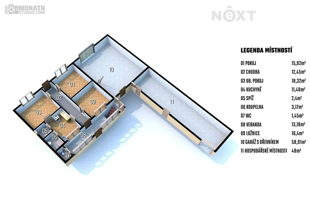 Velkou výhodou je prostorná garáž (59 m²) s průjezdem, která nabízí dostatek místa nejen pro parkování, ale i pro dílnu či další využití.