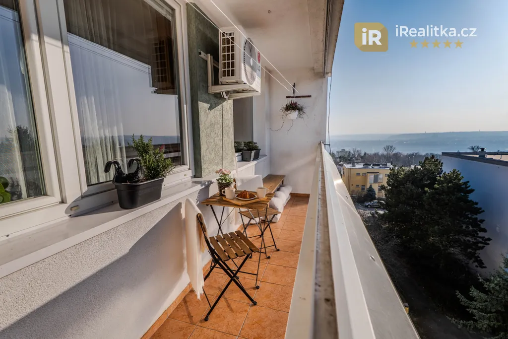 Dominantou bytu je prosvětlený obývací pokoj se vstupem na slunnou, zasklenou lodžii (6.5 m2), ze které vidíte i na Pražský hrad, a také nově vybudovaná luxusní kuchyň s vestavěnými spotřebiči v hodnotě 300.000,- Kč. Tato část bytu je orientována na západ.