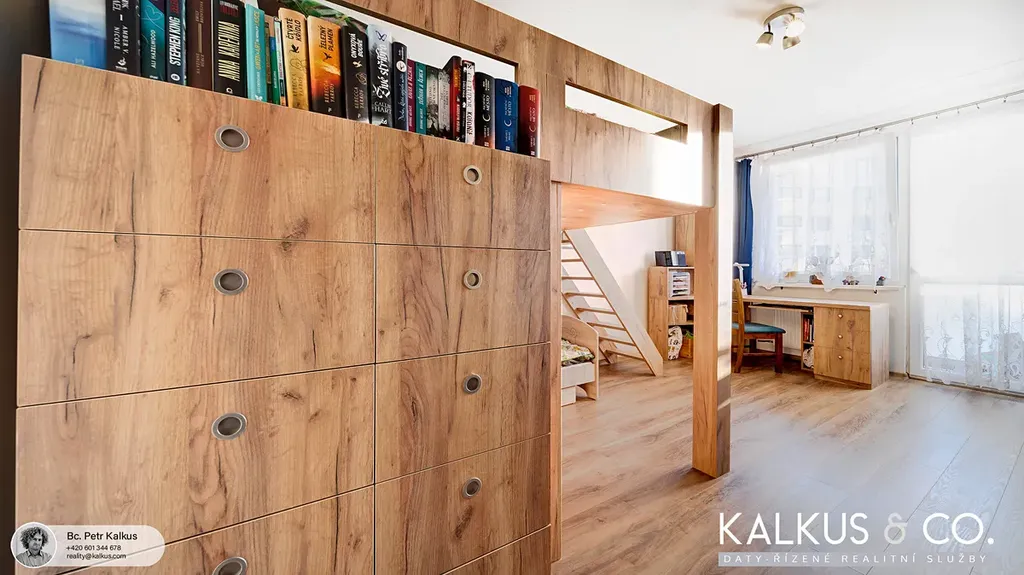 Součástí prodeje je také vestavěné patrové spaní pro až čtyřčlennou rodinu a prostorná vestavěná skříň v předsíni.