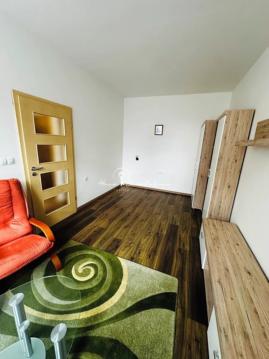 Dispozice bytu je 1+1, obývací pokoj a kuchyně jsou orientovány na jih. Na oknech jsou namontovány venkovní žaluzie.