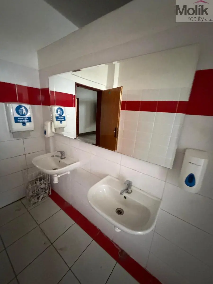 Interiér aktuálně nabízí prostornou halu, připravenou kancelář a kompletní zázemí pro zaměstnance včetně jídelny a sociálního zařízení.
