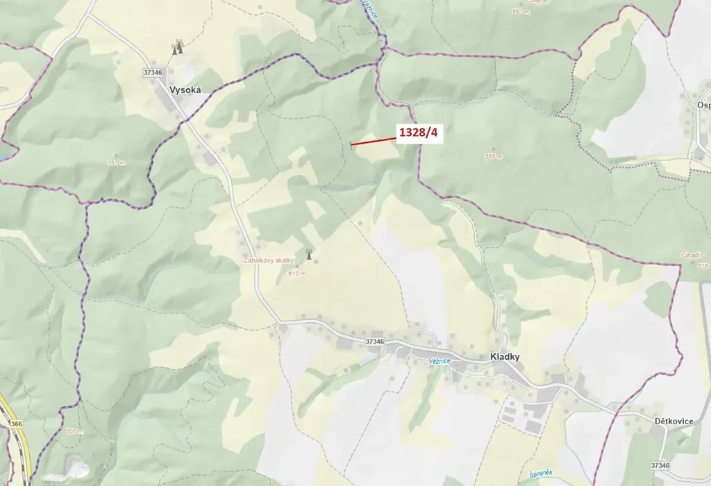 Lesní pozemek o výměře 199 m2, parcelní číslo 1328/4, podíl 1/1, katastrální území Kladky, obec Kladky, obec s rozšířenou působností Konice, okres Prostějov, Olomoucký kraj.