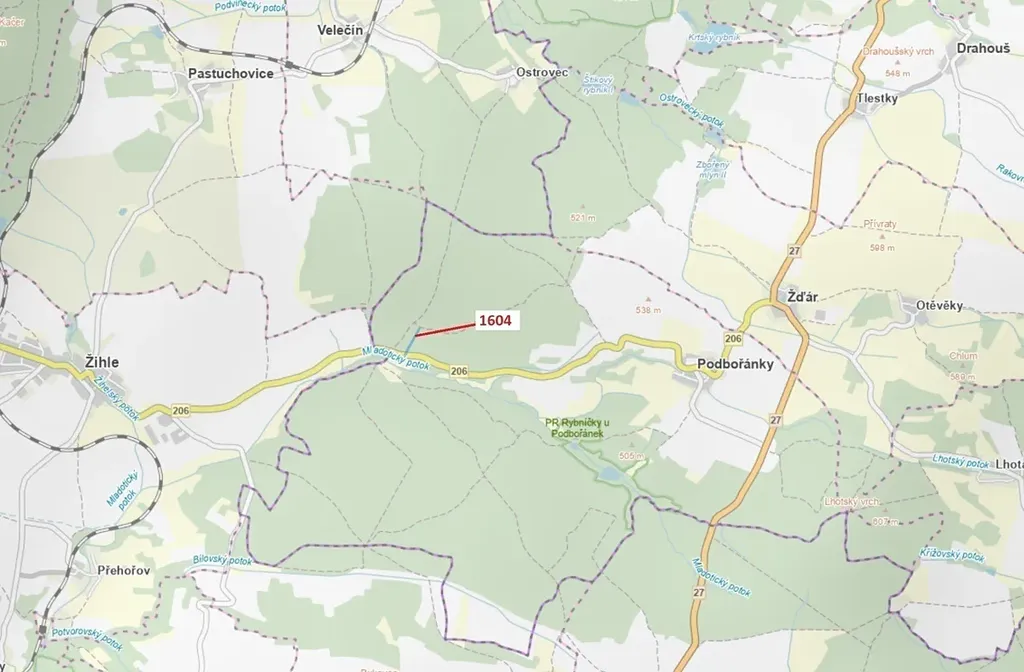 Lesní pozemek o výměře 4076 m2, parcelní číslo 1604, podíl 1/1, katastrální území Podbořánky, obec Jesenice, obec s rozšířenou působností Rakovník, okres Rakovník, Středočeský kraj. Po těžbě.
