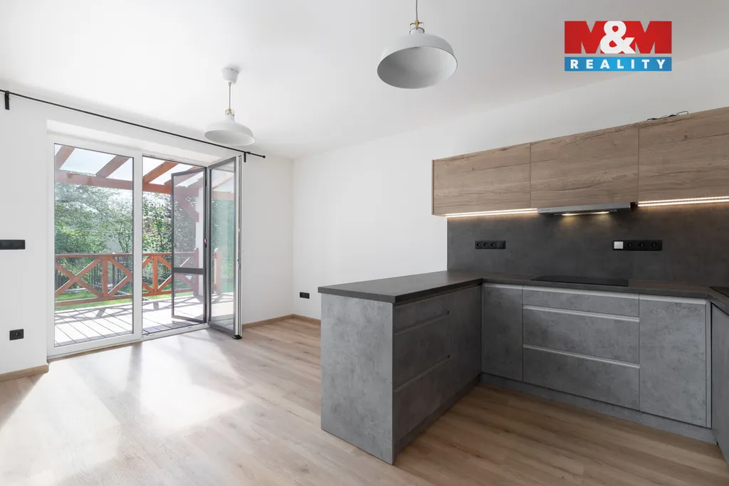 Interiér nabízí designovou kuchyni s vestavěnými spotřebiči, PODLAHOVÉ vytápění doplněné o kachlová kamna, dvě koupelny i dostatek úložných prostor včetně sklepa a praktického zázemí pod terasou.