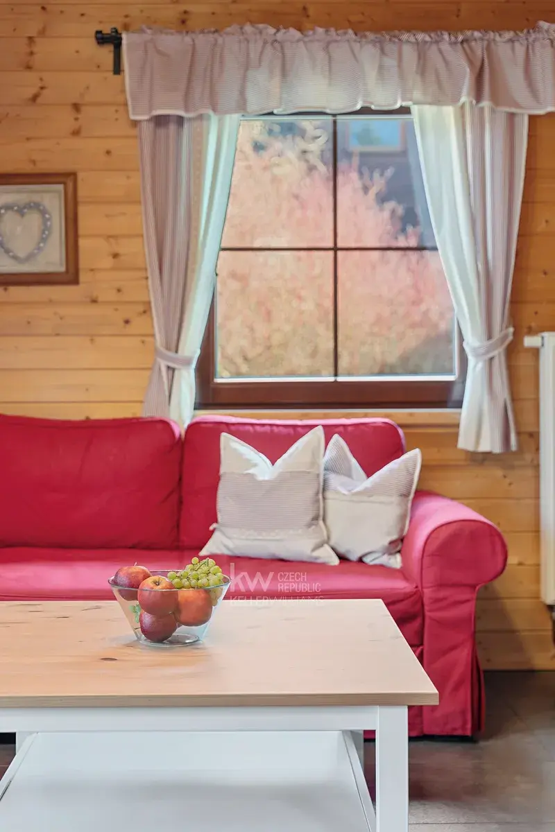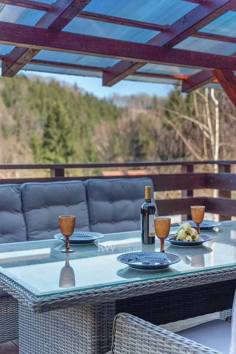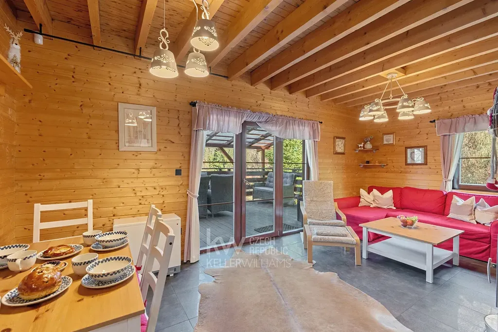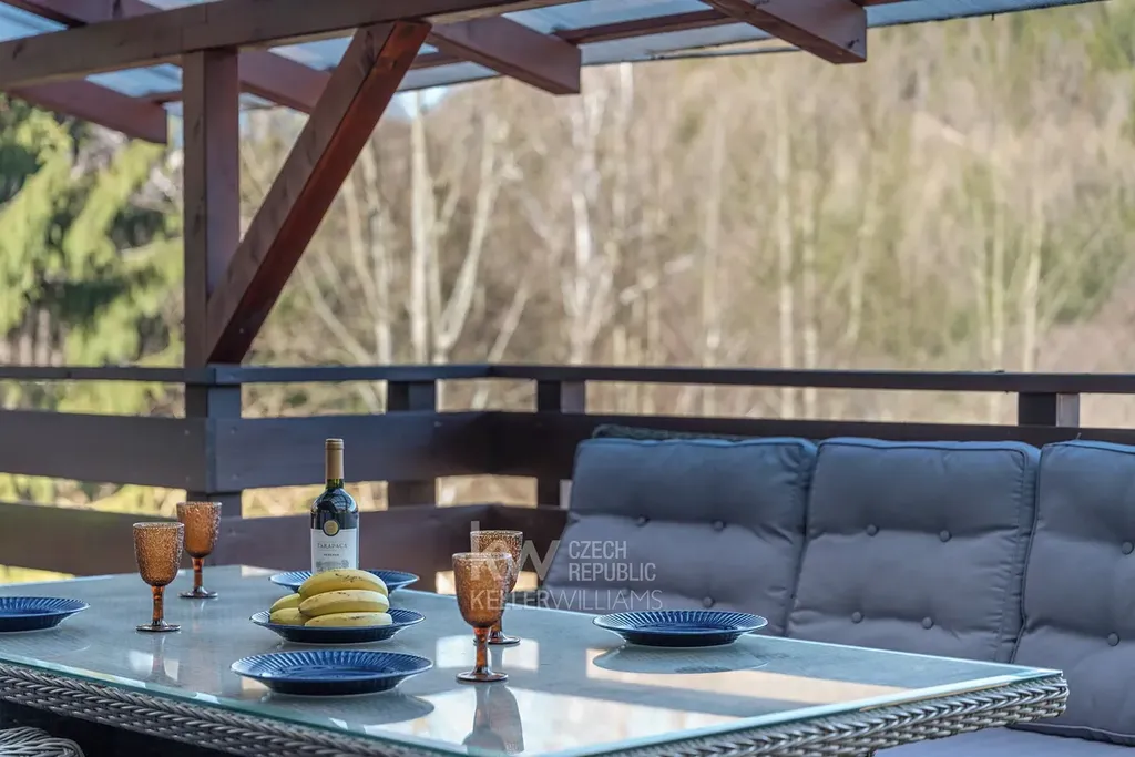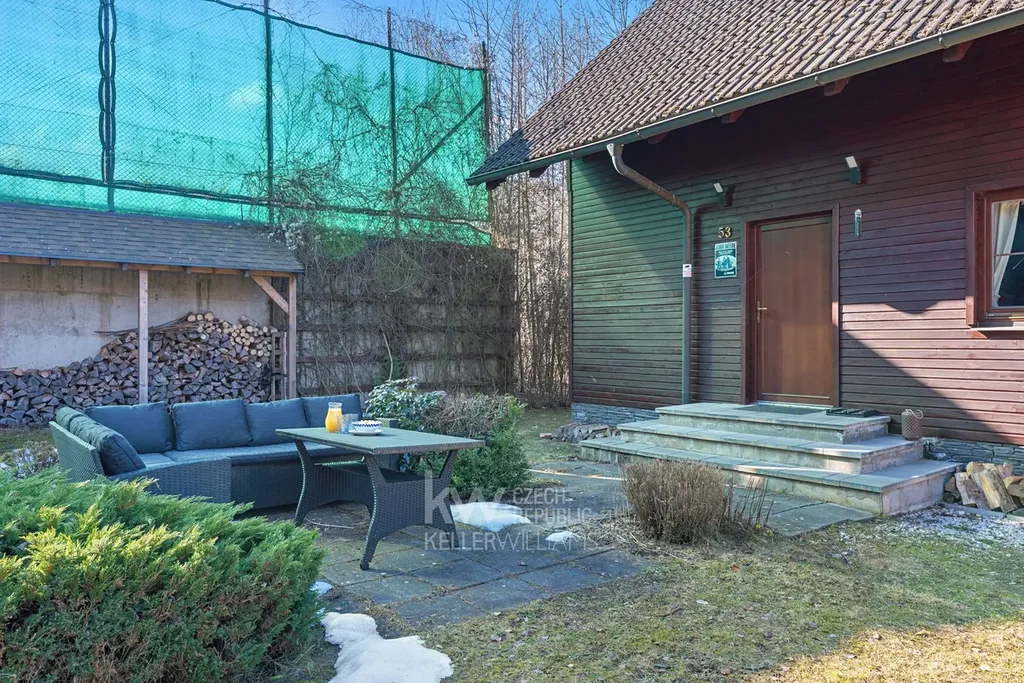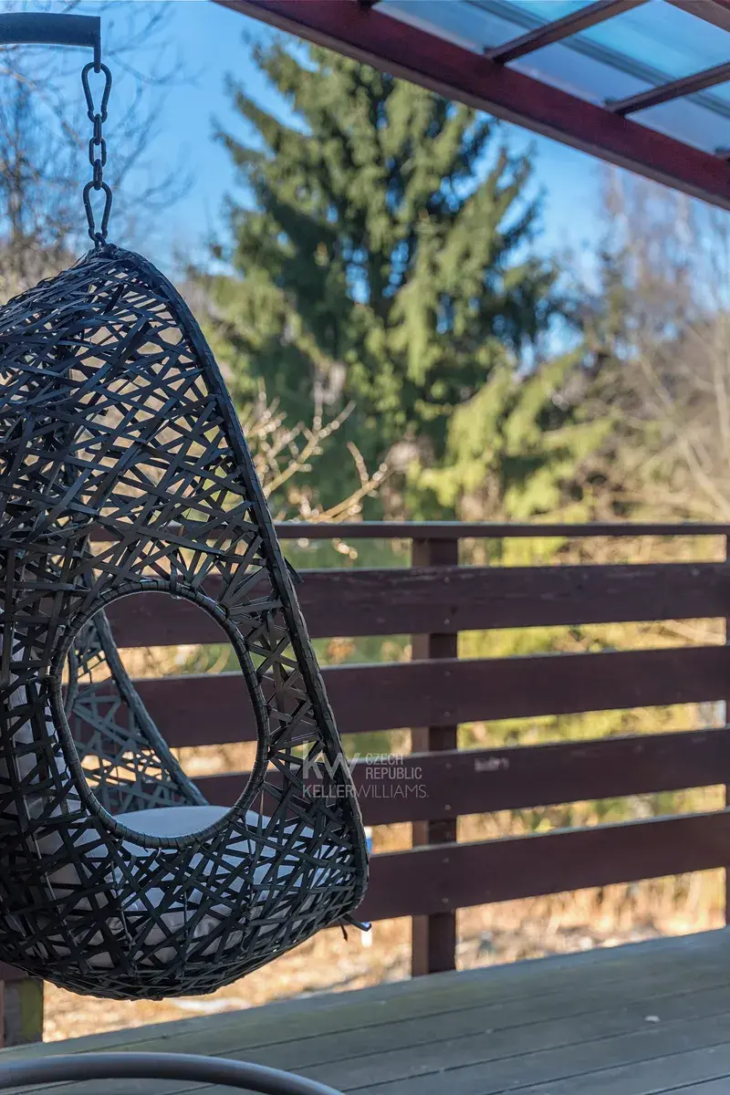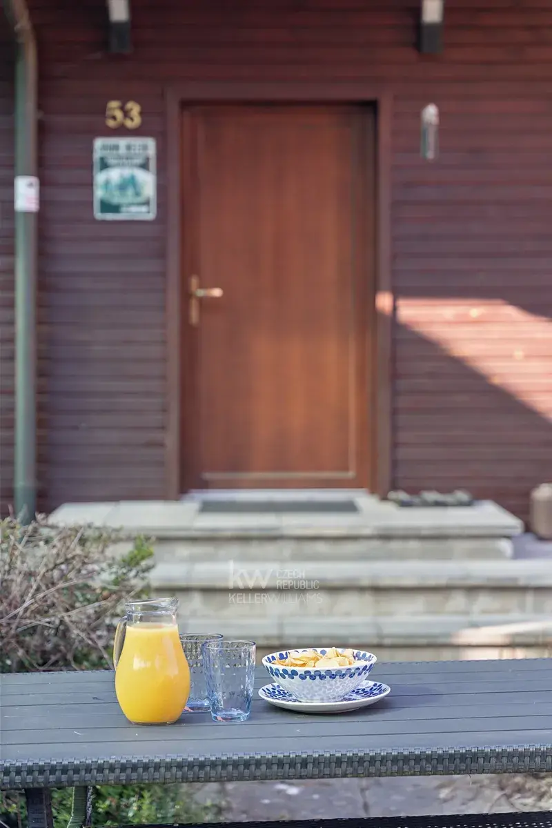 Velkým benefitem je také garáž přímo pod domem, terasa a venkovní posezení vedle chaty i prostor za domem. Nemovitost prošla úpravami, mimo jiné má prakticky novou pergolu, a prodává se kompletně vybavená, včetně nábytku, spotřebičů i televize. Nový majitel tak může chatu okamžitě začít využívat bez nutnosti dalších investic.