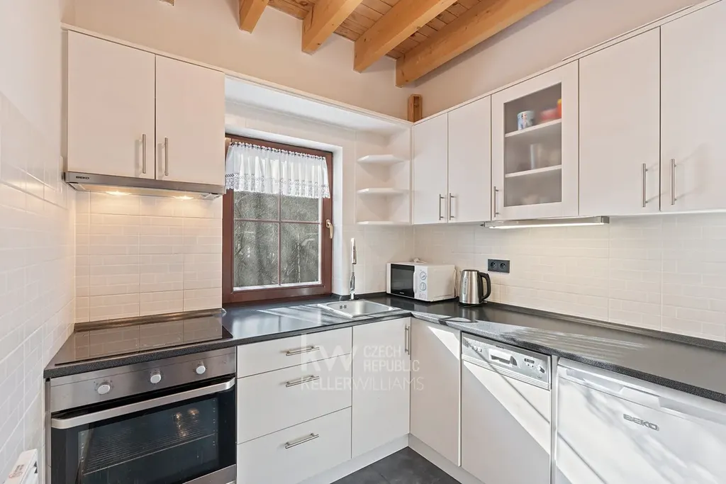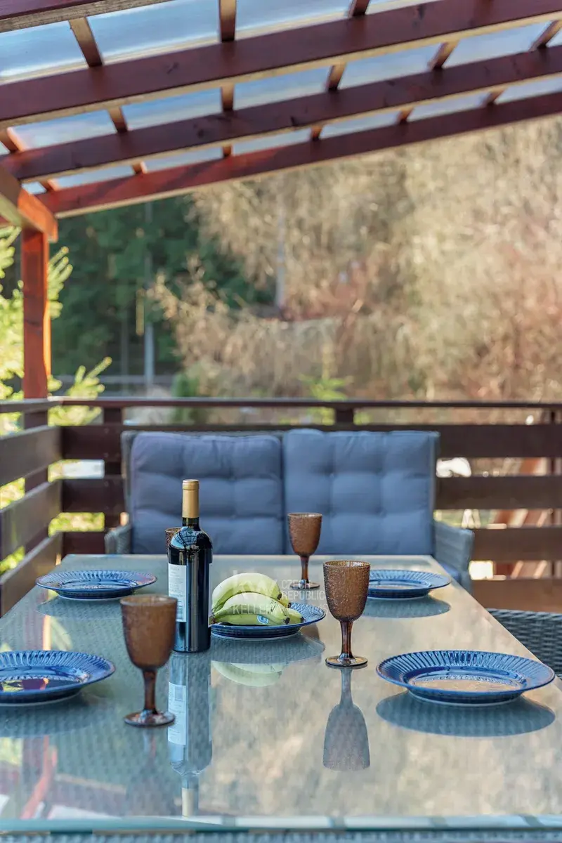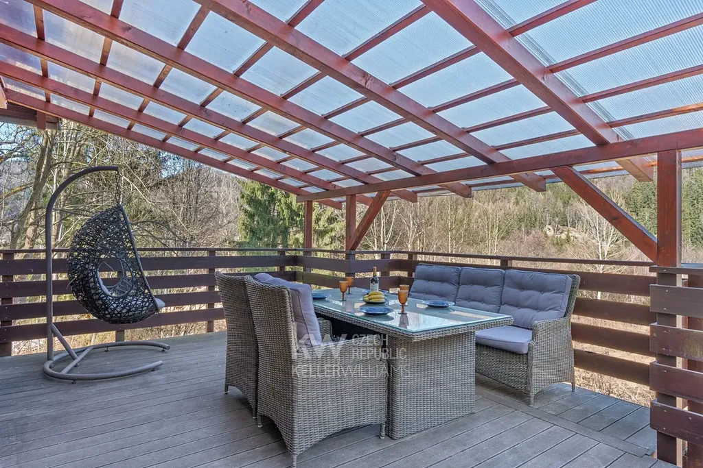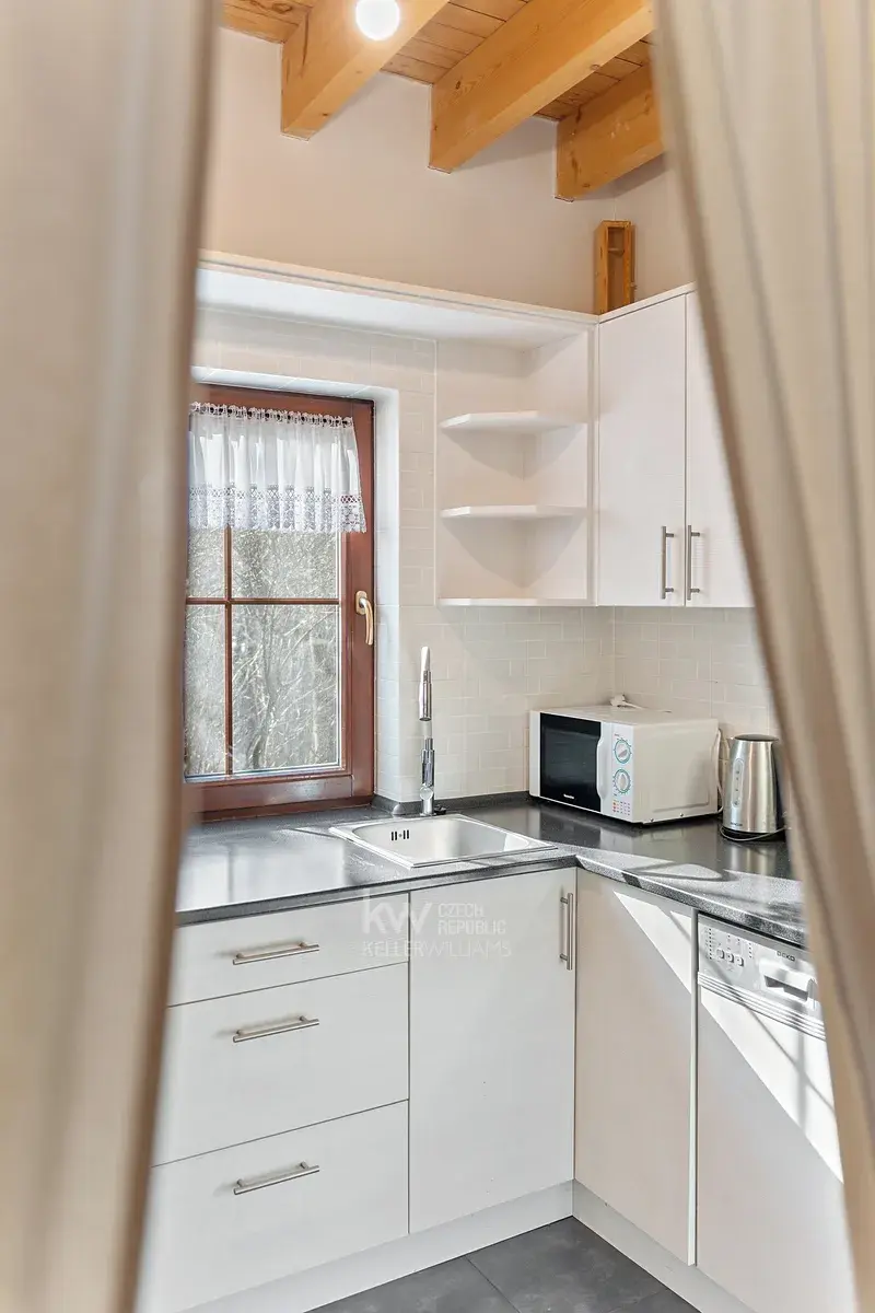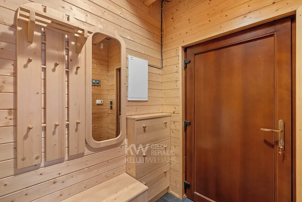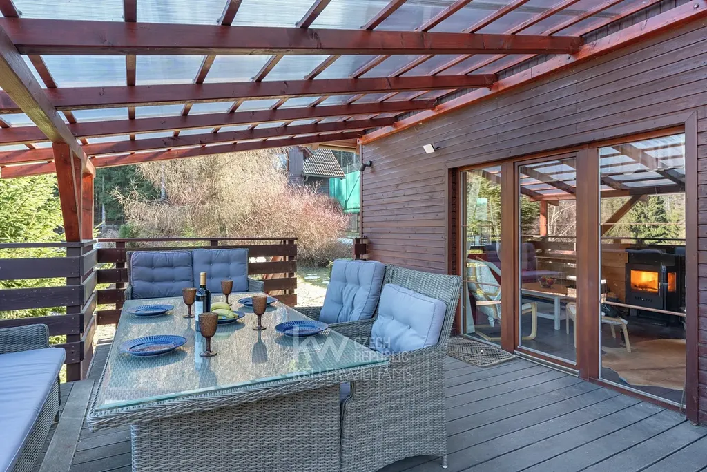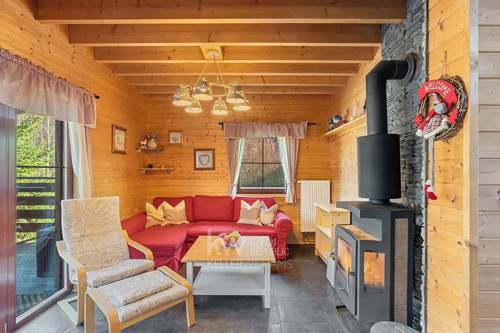 Velkým benefitem je také garáž přímo pod domem, terasa a venkovní posezení vedle chaty i prostor za domem. Nemovitost prošla úpravami, mimo jiné má prakticky novou pergolu, a prodává se kompletně vybavená, včetně nábytku, spotřebičů i televize. Nový majitel tak může chatu okamžitě začít využívat bez nutnosti dalších investic.