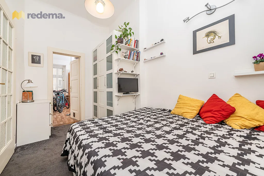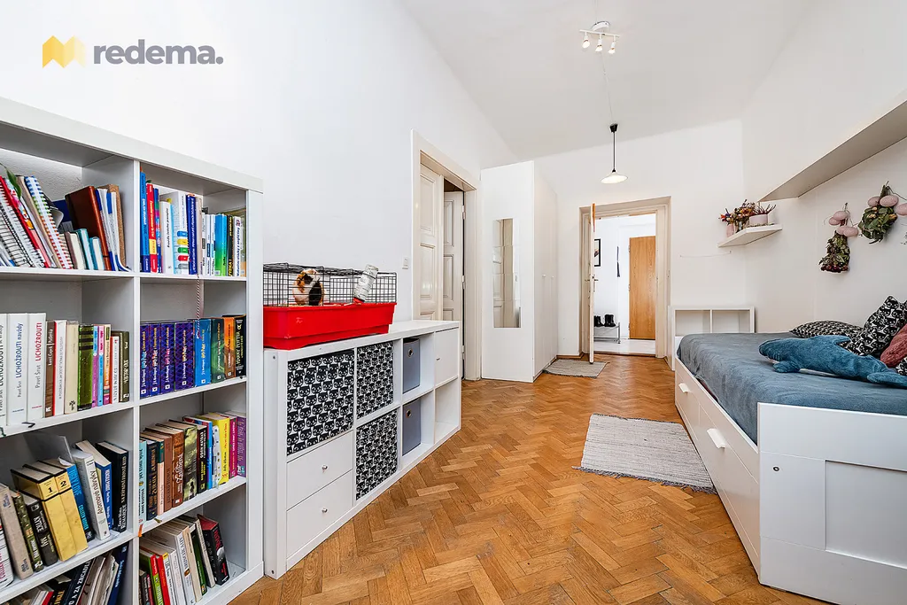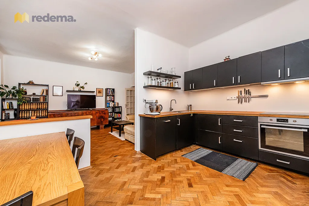 Původní dispozice 3+1 prošla citlivou rekonstrukcí a byla upravena na velmi efektivní 4+kk. Interiér působí vzdušně a elegantně, k čemuž významně přispívají vysoké stropy. Dominantou bytu je velkorysý obývací pokoj propojený s kuchyní a jídelnou (s plochou zhruba 39 m²), který tvoří přirozené centrum celého domova – ideální prostor pro rodinný život i setkávání s přáteli.