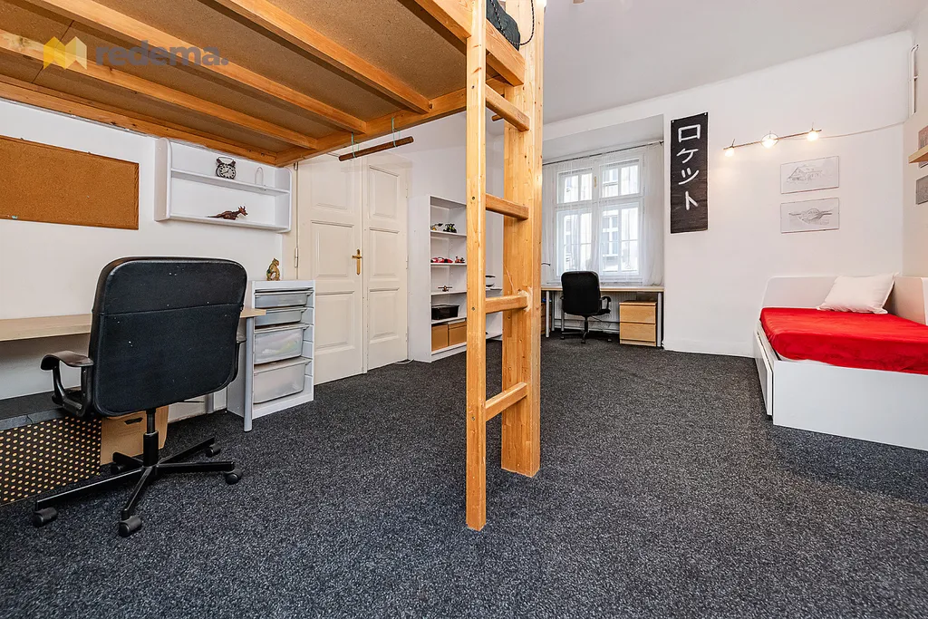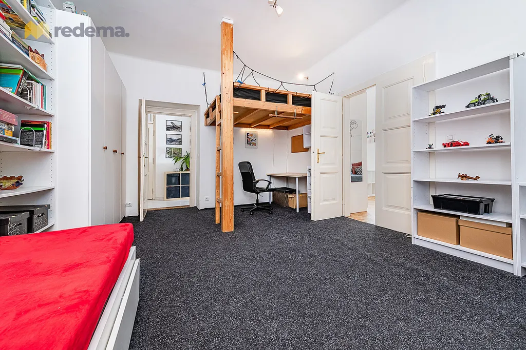 Byt nabízí dvě dětské místnosti (~16 a ~22 m²), které jsou mezi sebou propojené, přičemž každá má vlastní vstup. Jedna z nich je navíc doplněna o prakticky vybudované patro, které skvěle využívá výšku stropu a poskytuje dětem další prostor na spaní nebo hraní.