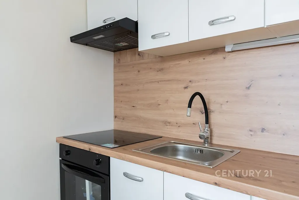 • Moderní kuchyňská linka s vestavnými spotřebiči (elektrická trouba se sklokeramickou deskou a digestoř) je propojena s obývacím prostorem)