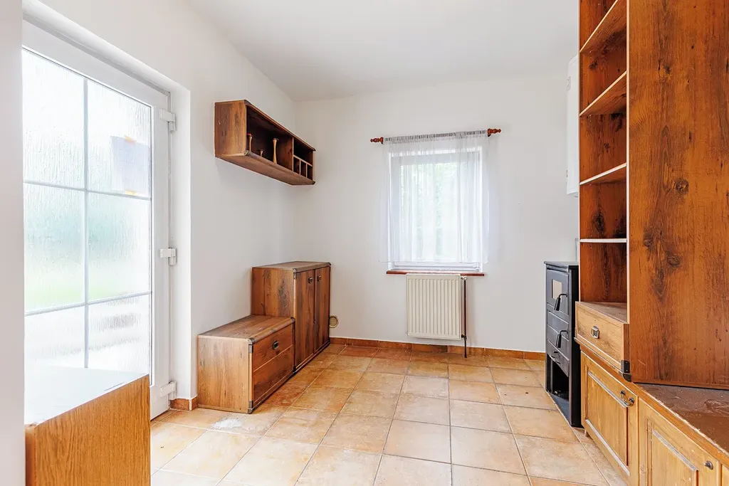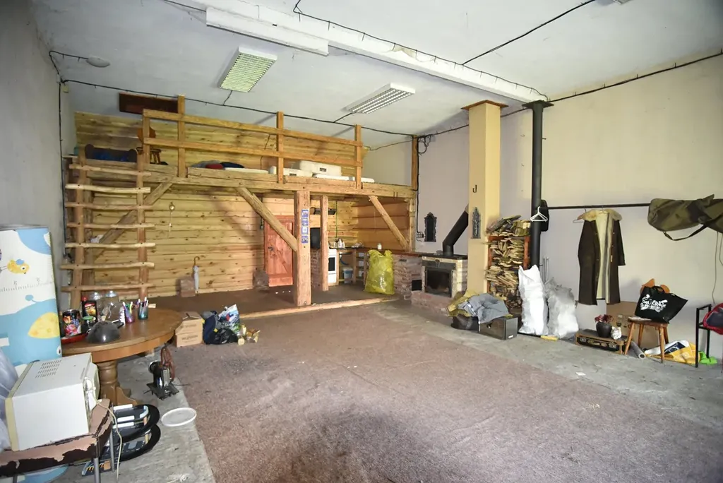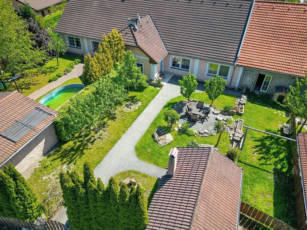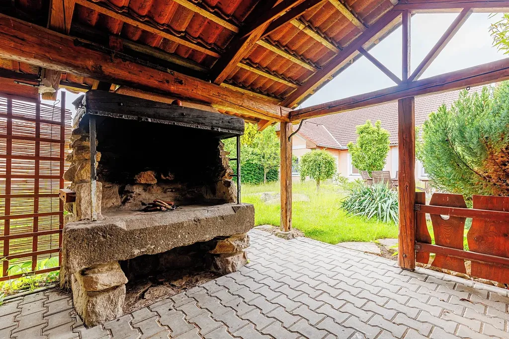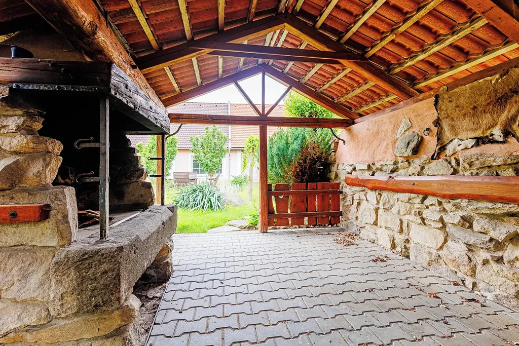 Součástí domu je dále velký prostor přes celou šířku objektu využívaný jako sklad 41 m2 a dále stodola 65 m2 (část se světle červenou střešní krytinou) využívaná jako klubovna. Uvnitř je vybudováno dřevěná patro pro přespání, dole je k dispozici kuchyňka a krbová vložka sloužící pro vytápění klubovny. Oba tyto prostory umožňují další rozšíření obytného prostoru domu. Dům má velmi hezkou a udržovanou zahradu s venkovním posezením, krytou pergolou s venkovní grilem a krytým přístřeškem pro dva osobní automobily.