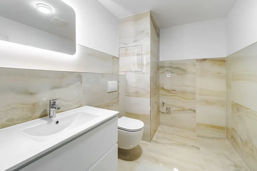 Koupelny jsou řešeny v moderním designu s velkoformátovými obklady, vanou i sprchovým koutem a kvalitní sanitou, což zajišťuje vysoký komfort každodenního bydlení.