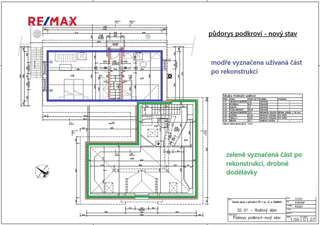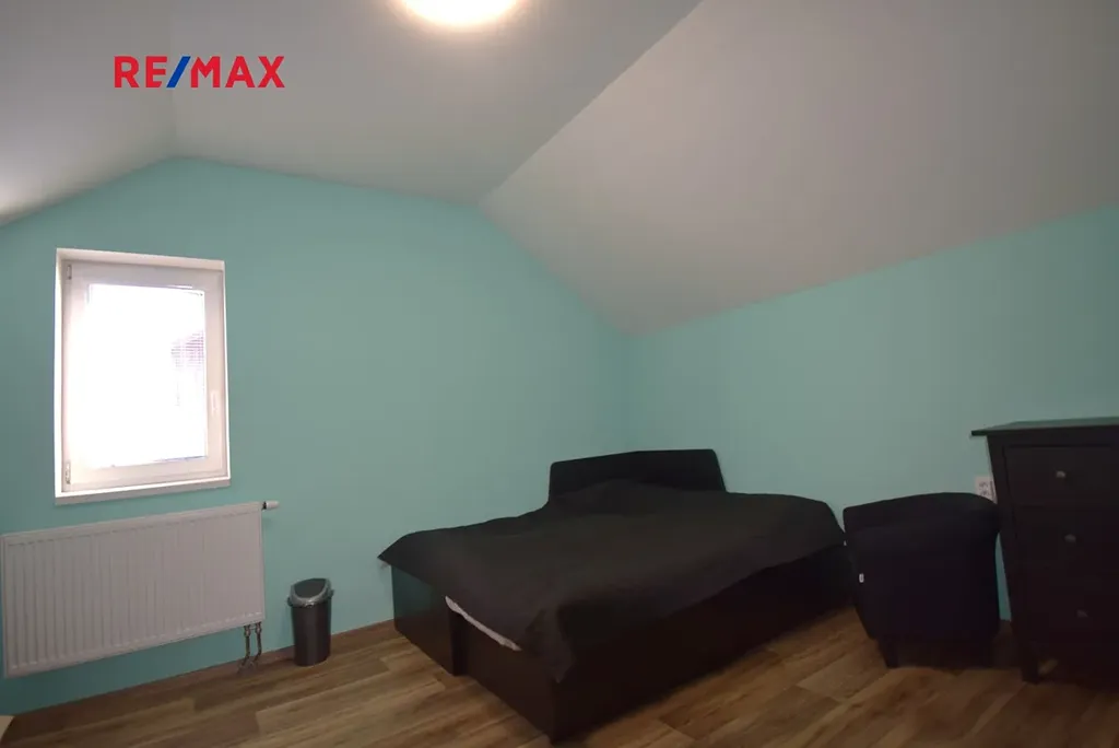 V podkroví jsou dvě ložnice, které jsou dodělány a využívány. Do budoucna se zvažovalo další využití podkroví. Z tohoto důvodu je předpřipravena další část, tedy koupelna se sprchovým koutem a přípravou na WC a k vlastnímu bydlení je zde místnost cca 40m2 s přípravou na kuchyňský kout. Po drobné úpravě je možné vše upravit jako samostatnou bytovou jednotku.