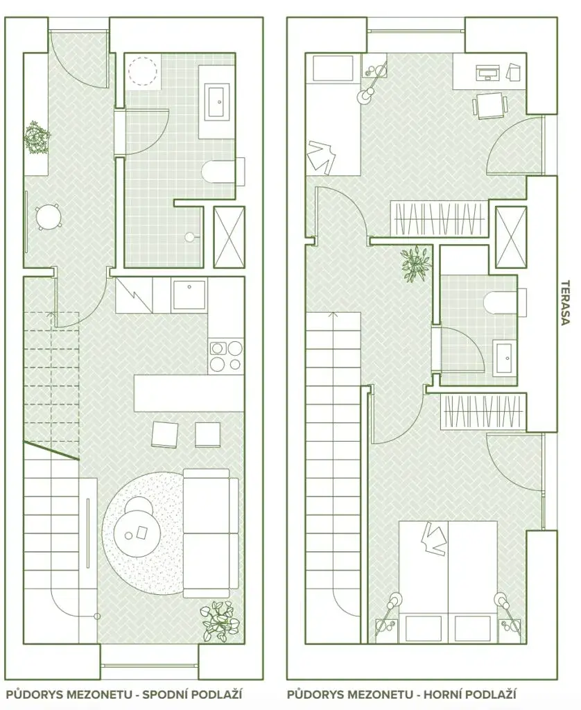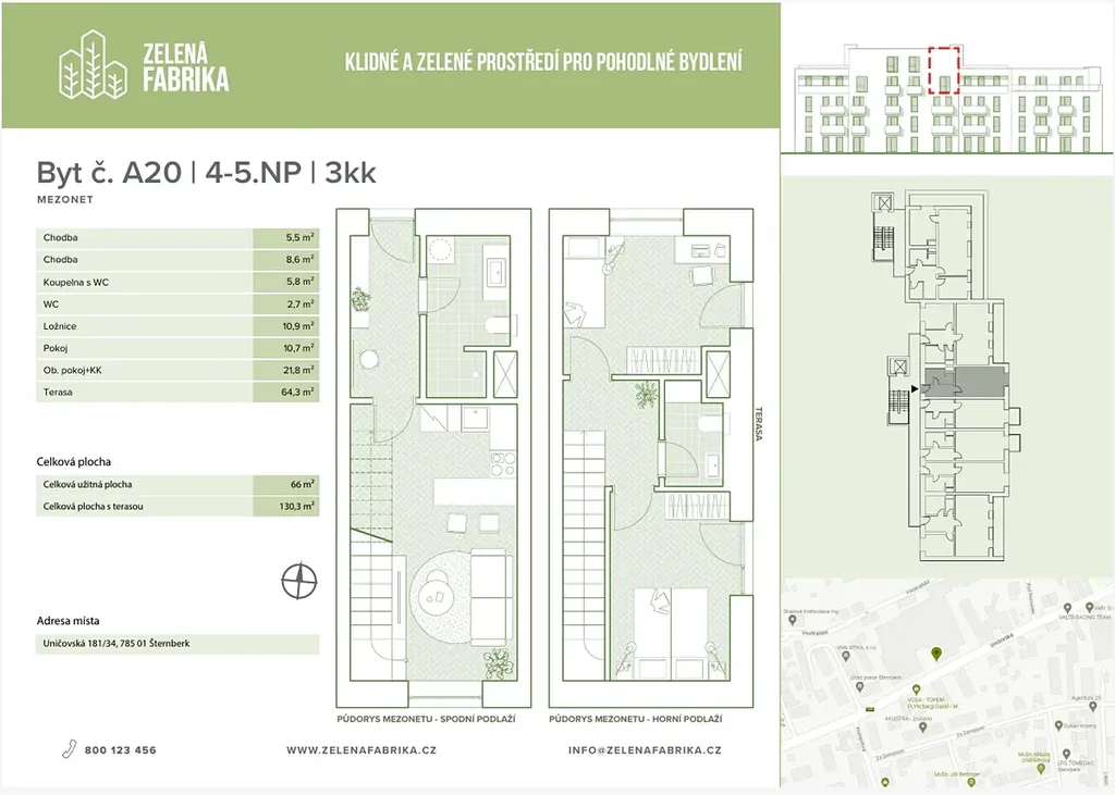 Nabízíme mezonetový byt 3+kk o užitné ploše 66 m² ve 4.–5. nadzemním podlaží (byt A20) s prostornou terasou 64,3 m² v rámci 3. etapy projektu Zelená Fabrika ve Šternberku.