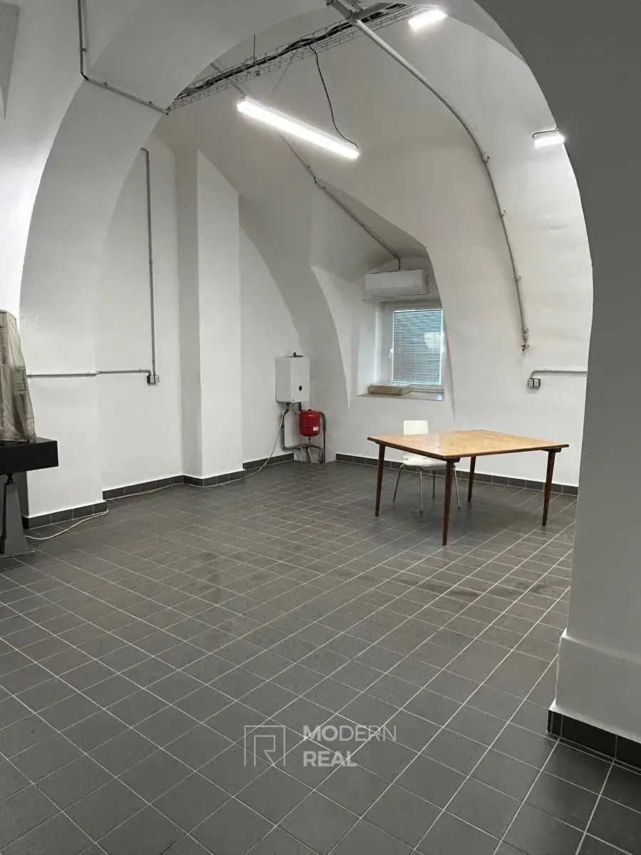 V přízemí oddělená kancelář 5,3 m x 7,7m. WC a sprcha.