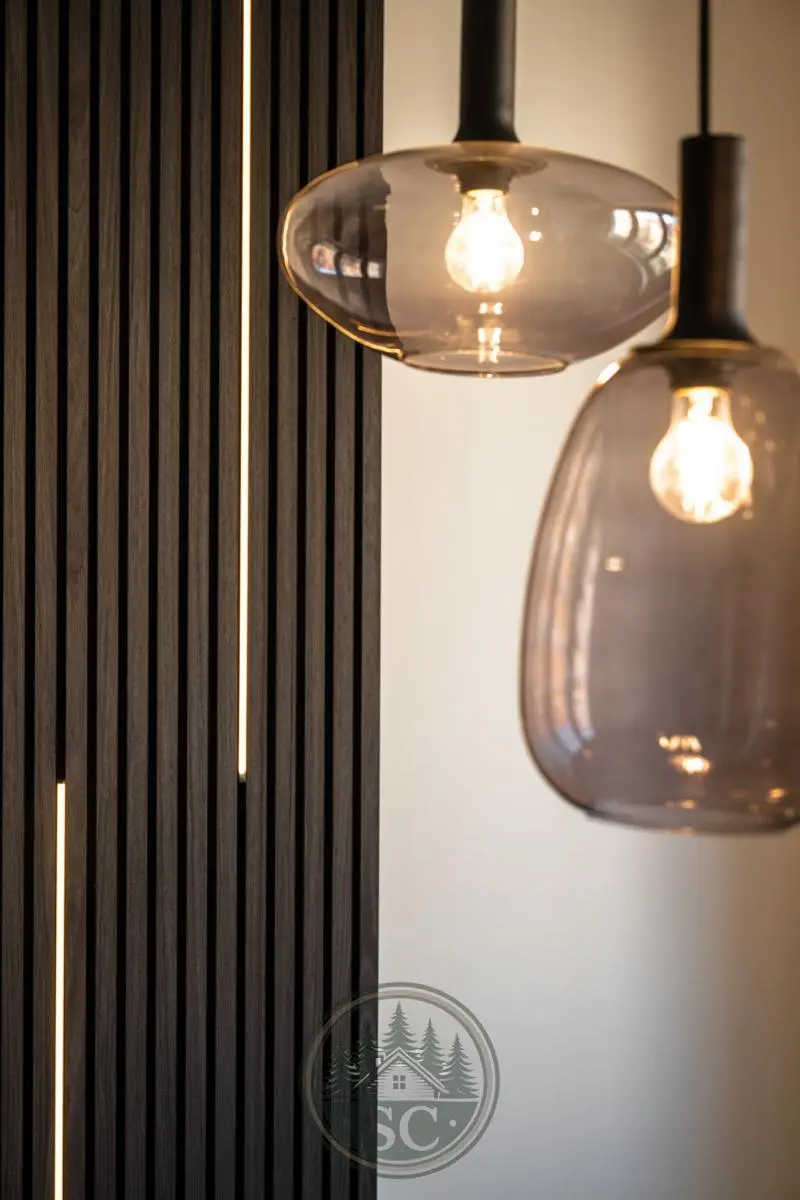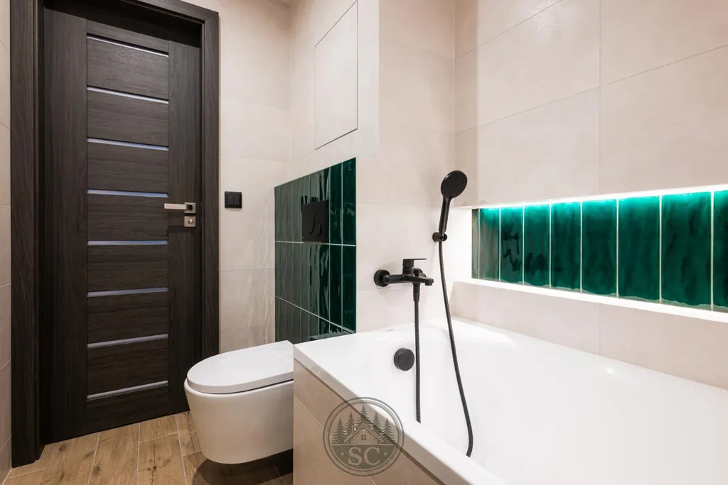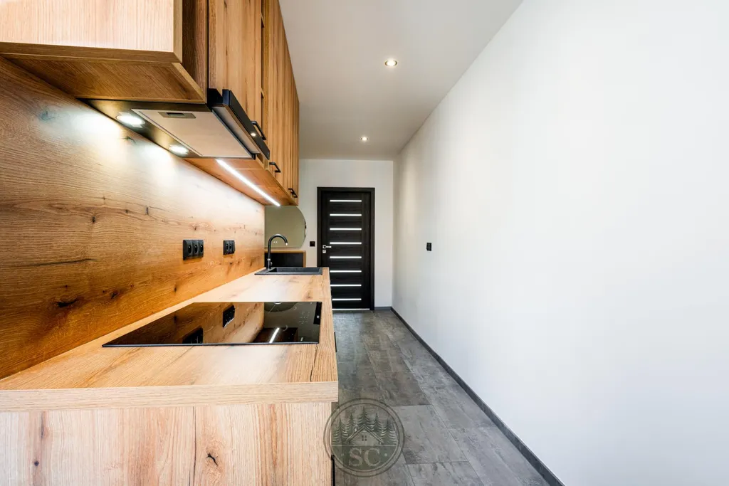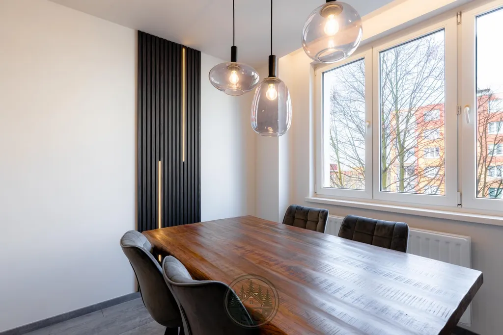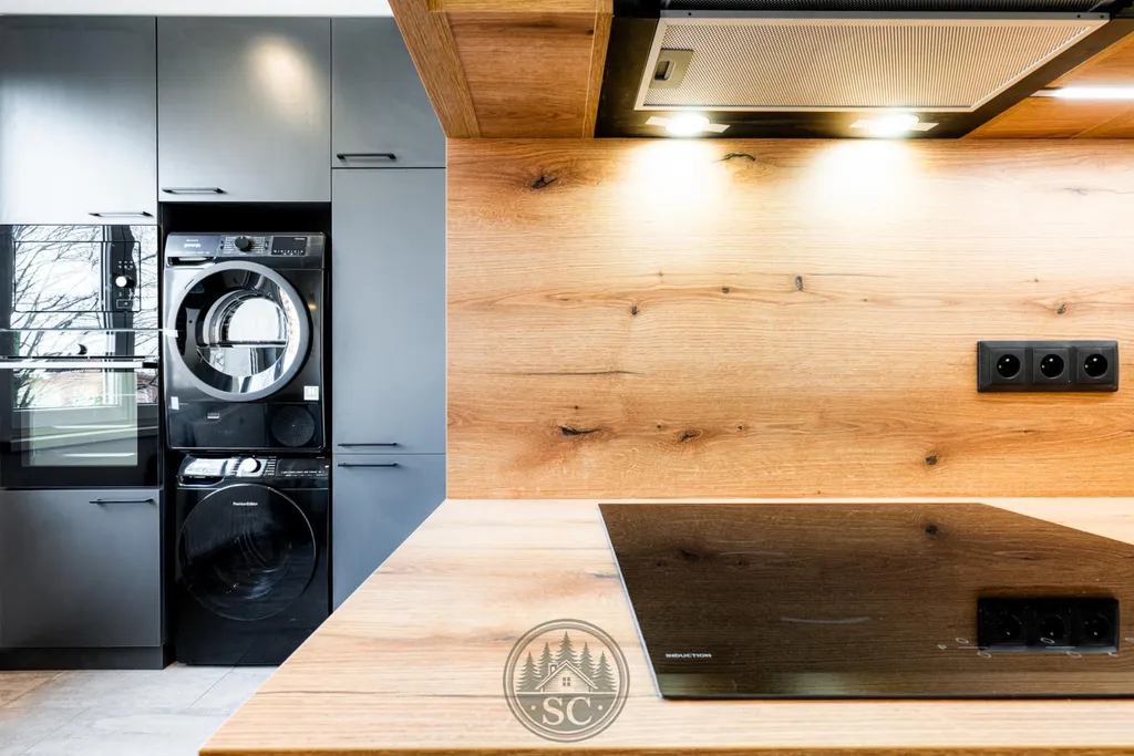 Kuchyňská linka a vestavné skříně na míru od truhláře, masivní jídelní stůl, zabudované spotřebiče, obývací skříňka s přípravou pro TV, nádherná koupelna s podsvícenými nikami samozřejmostí jsou kompletní nové rozvody.