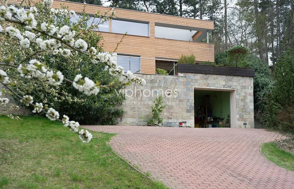 Vestavěné skříně, alarm, satelit, internet, myčka, terasa a zahrada skýtající naprosté soukromí. Garáž pro dva vozy plus parkovací stání na pozemku. Poplatky cca 10.000 Kč měsíčně.