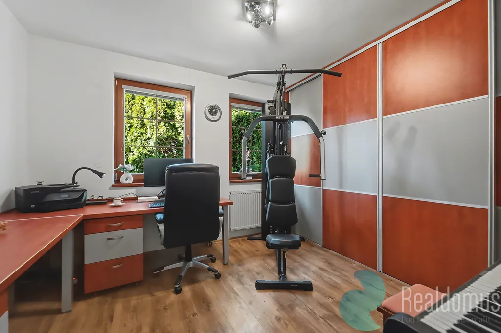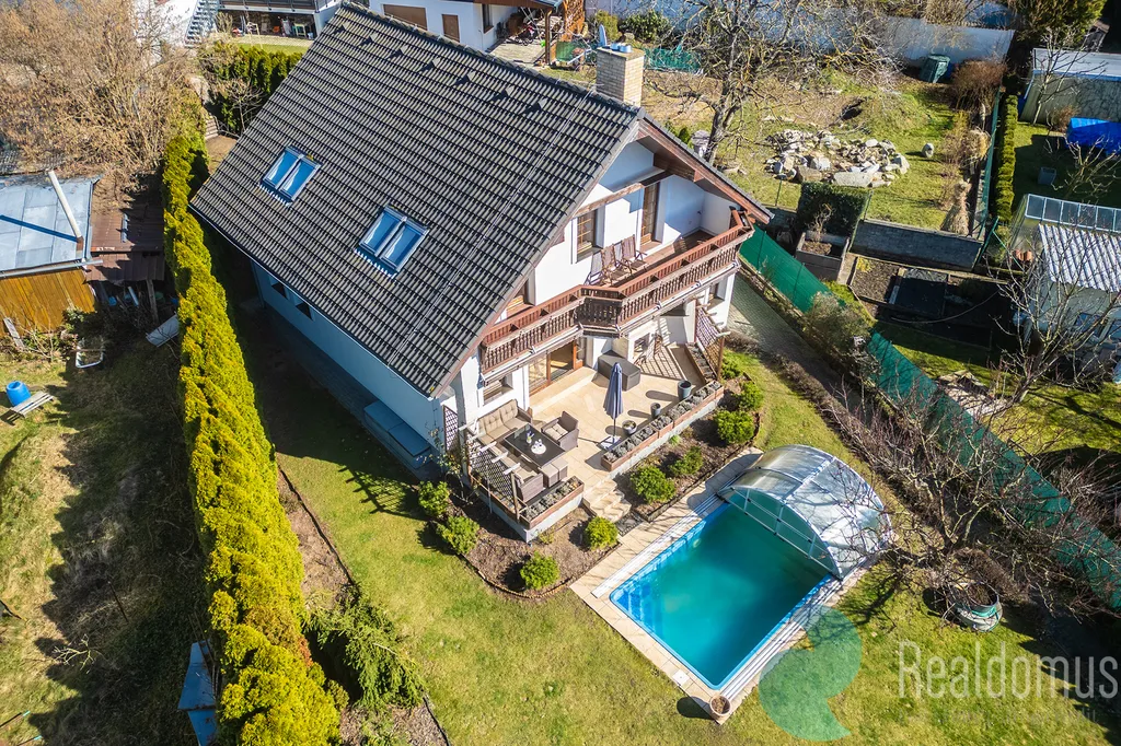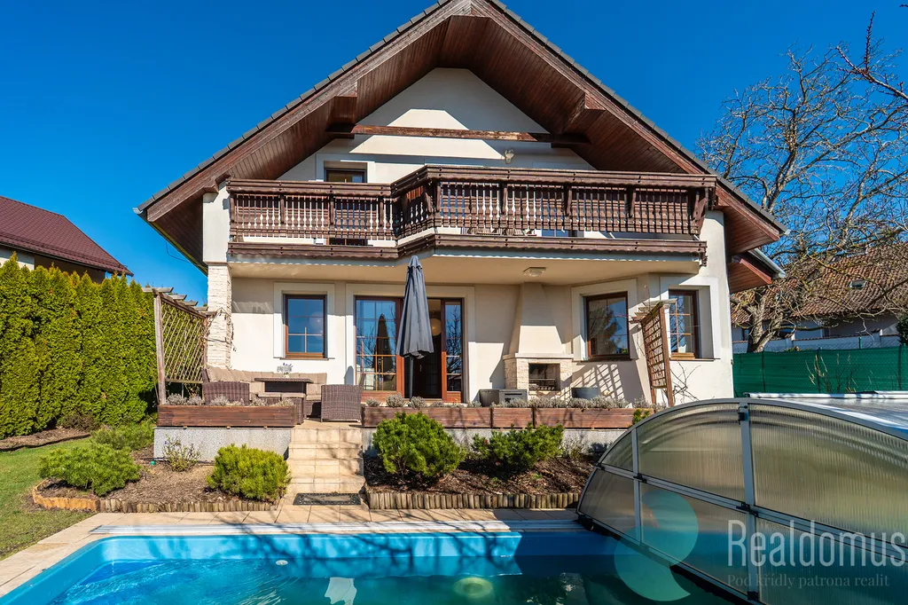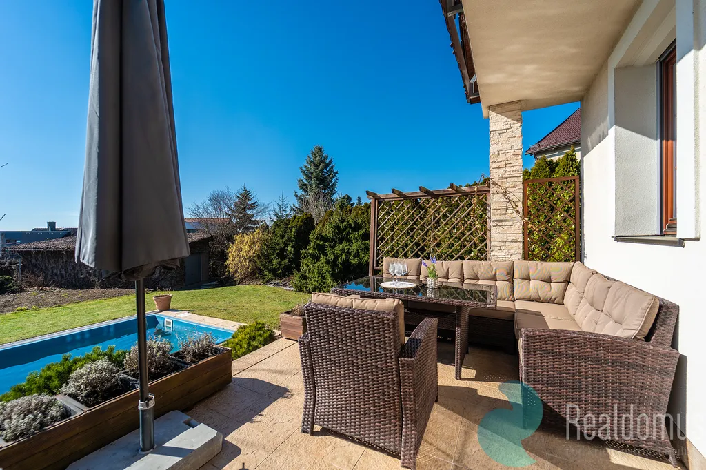 Dominantou domu je velkorysá terasa s krbem (25 m²), která plynule propojuje interiér se zahradou a krytým vyhřívaným bazénem (25 m²). V letních měsících terasa poskytuje plnohodnotný obytný prostor pro odpočinek, rodinná setkání i večery s přáteli. Z balkonu v patře i z terasy v přízemí se navíc otevírá krásný výhled do širokého okolí, jakých v Říčanech mnoho nenajdete.