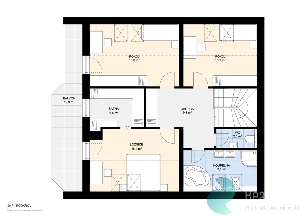 • podkroví: 3 ložnice, šatna, koupelna s toaletou, samostatná toaleta