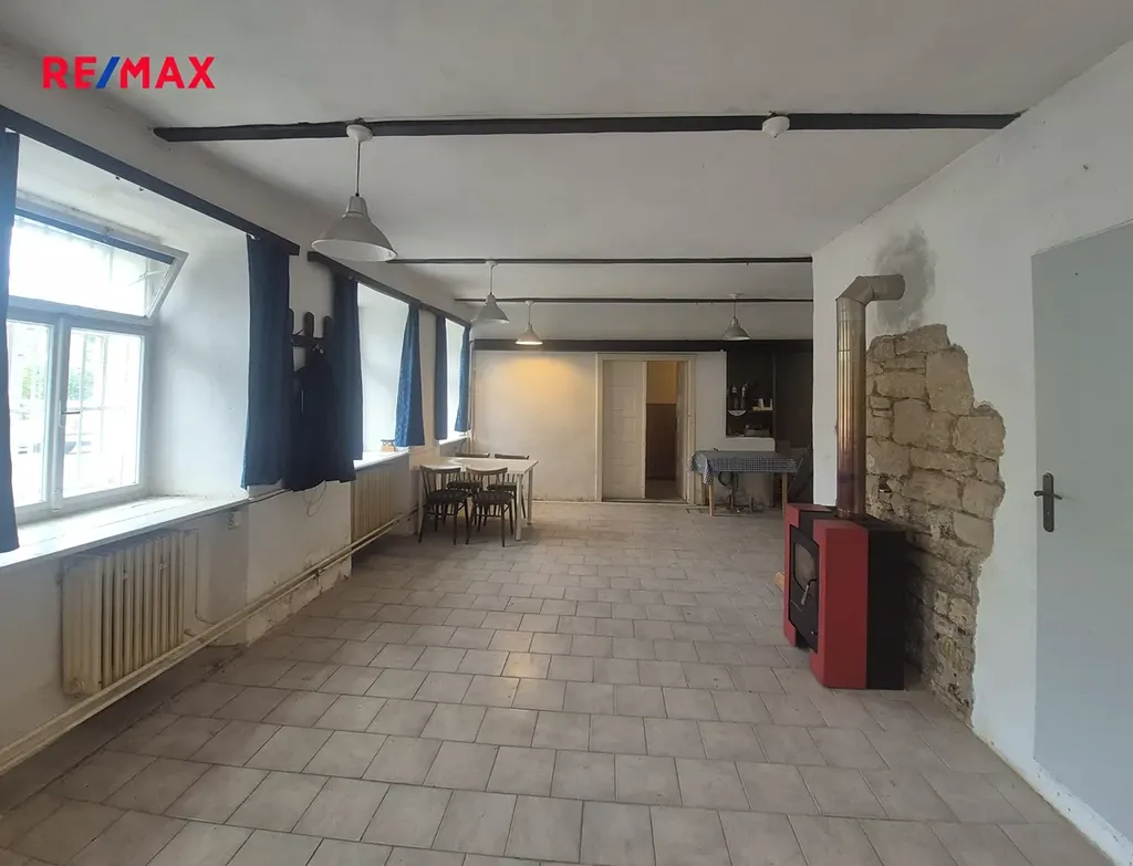 V přízemí o celkové výměře 155 m2 se nachází bývalý lokál hostince o výměře cca 38 m2, navazující malá kuchyňka, dále příslušenství, sklady, kotelna, sklípek a sociální zařízení.