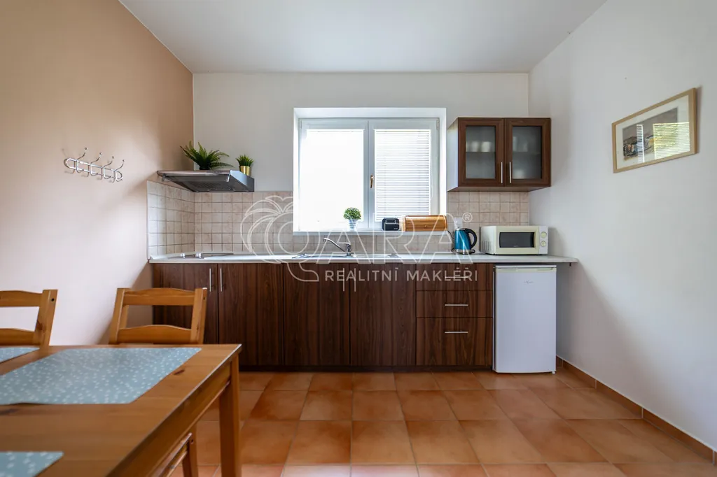 Nemovitost lze rozdělit a samostatně tak můžete koupit jen rodinný dům s pozemkem 750 m2, nebo samostatně jen dům s apartmány a nebo samostatný jeden apartmán.
