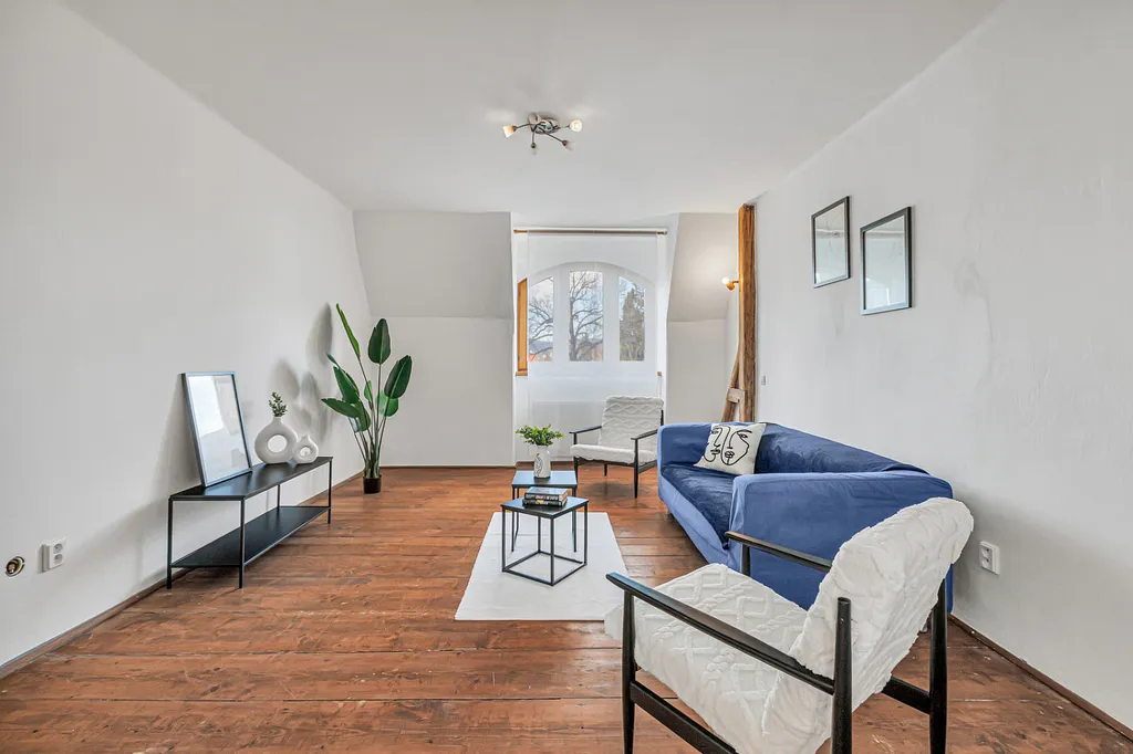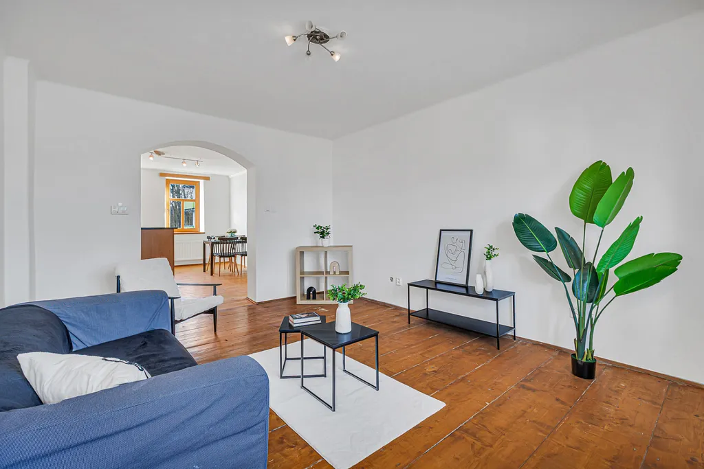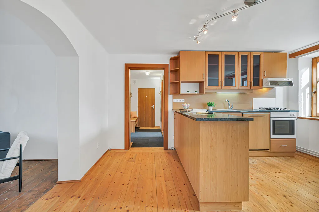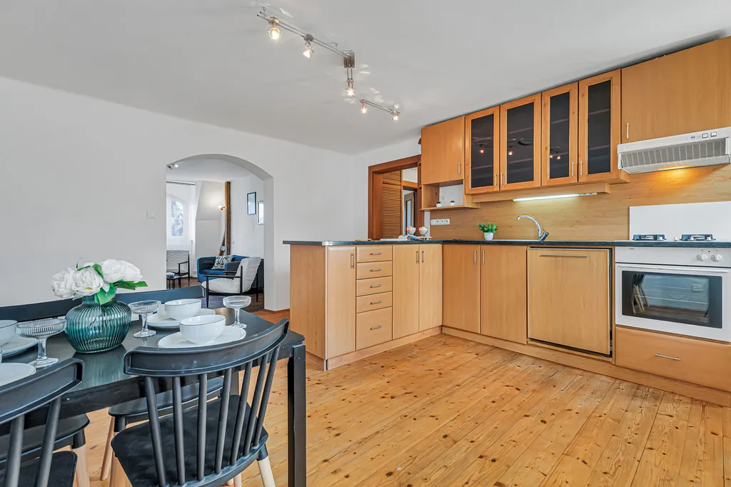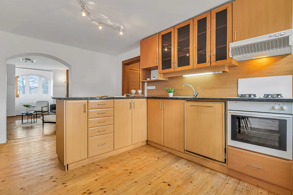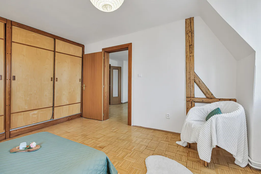 Byt zaujme především svou velkorysou dispozicí, světlem a příjemnou atmosférou. Najdete zde velké místnosti, dřevěné prvky, oblouky mezi místnostmi i přiznané trámy, které dávají prostoru charakter a odlišují ho od běžné nabídky.