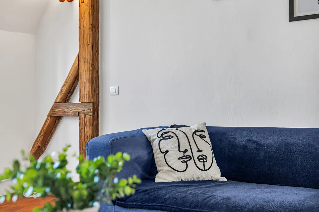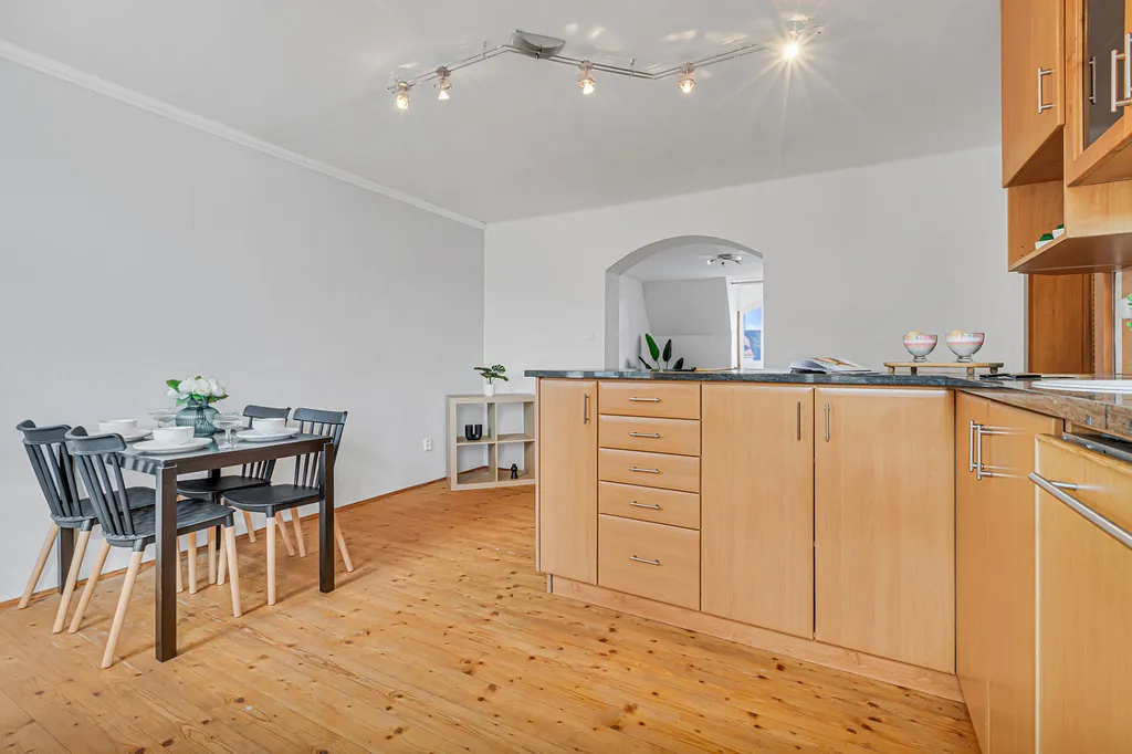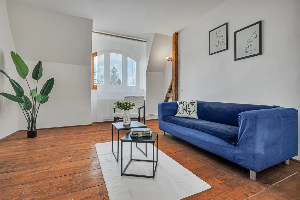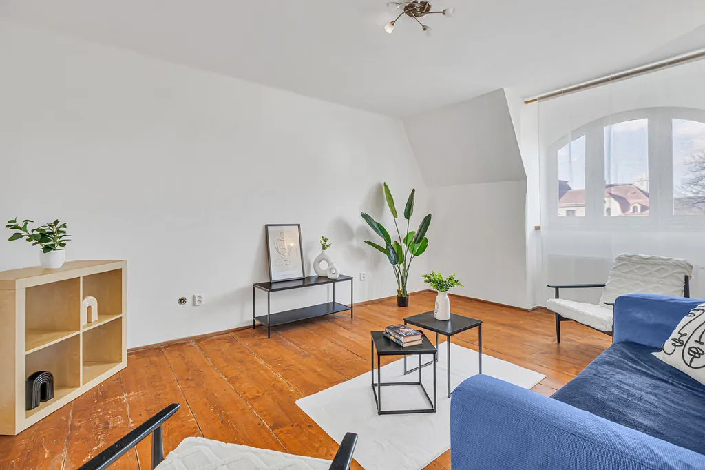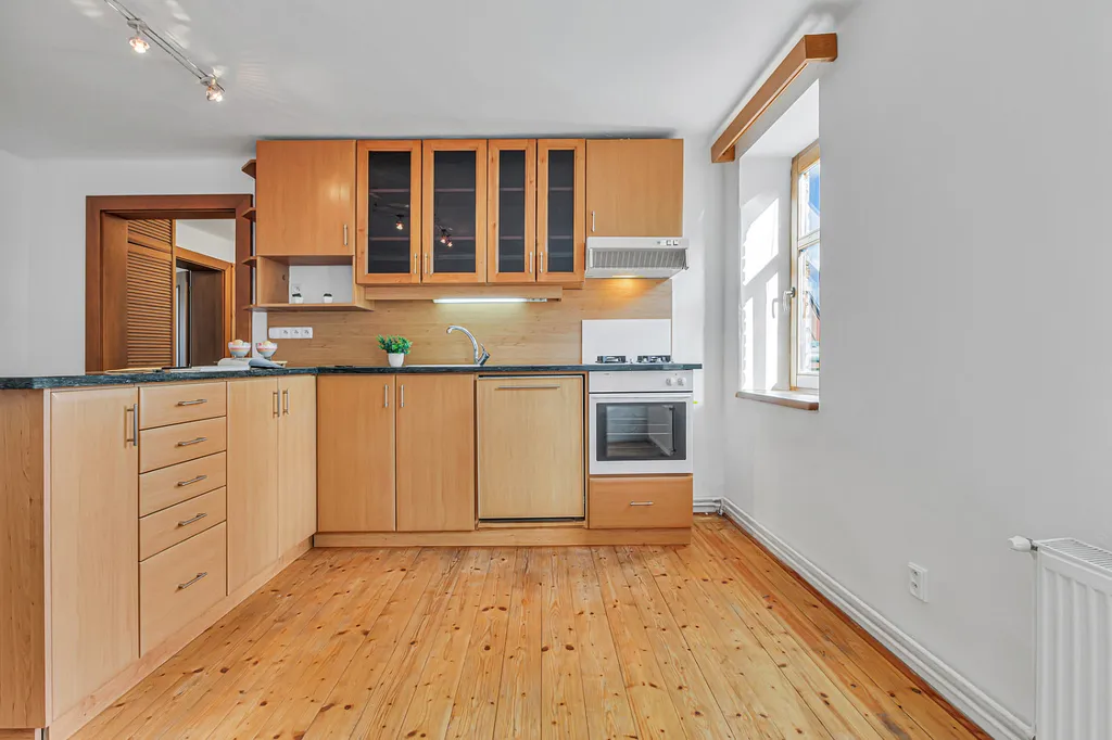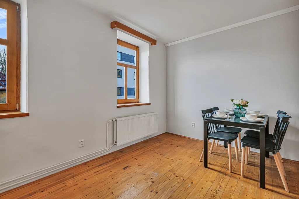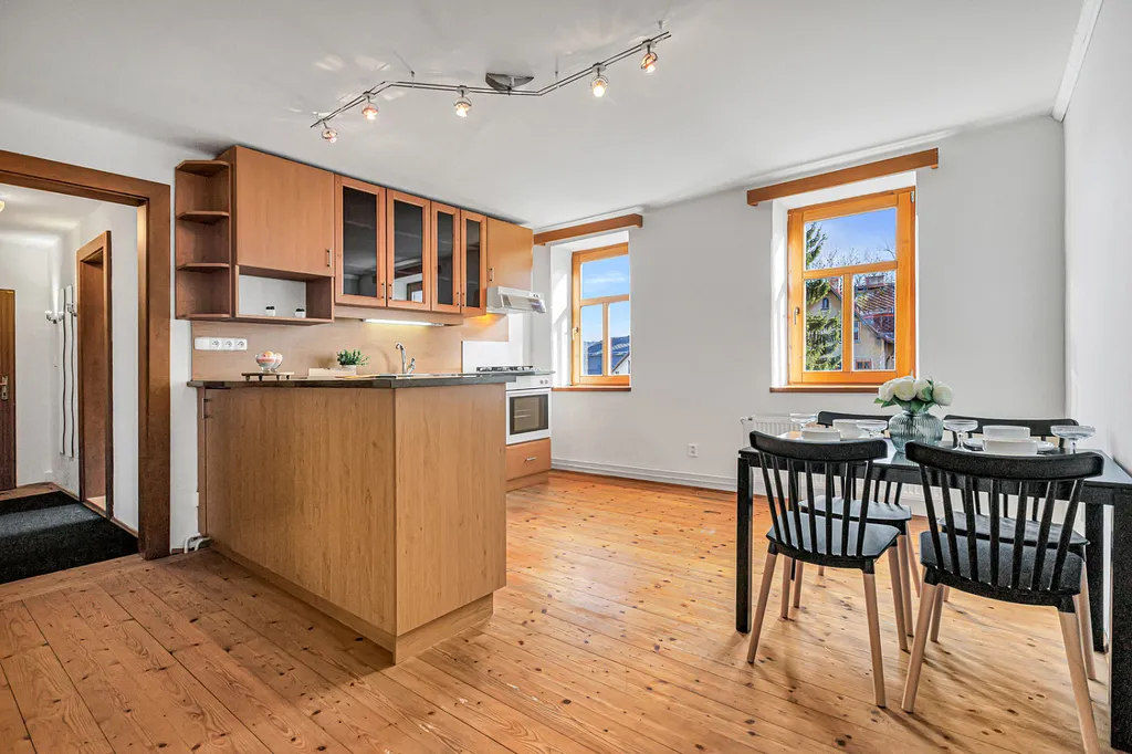 Byt zaujme především svou velkorysou dispozicí, světlem a příjemnou atmosférou. Najdete zde velké místnosti, dřevěné prvky, oblouky mezi místnostmi i přiznané trámy, které dávají prostoru charakter a odlišují ho od běžné nabídky.
