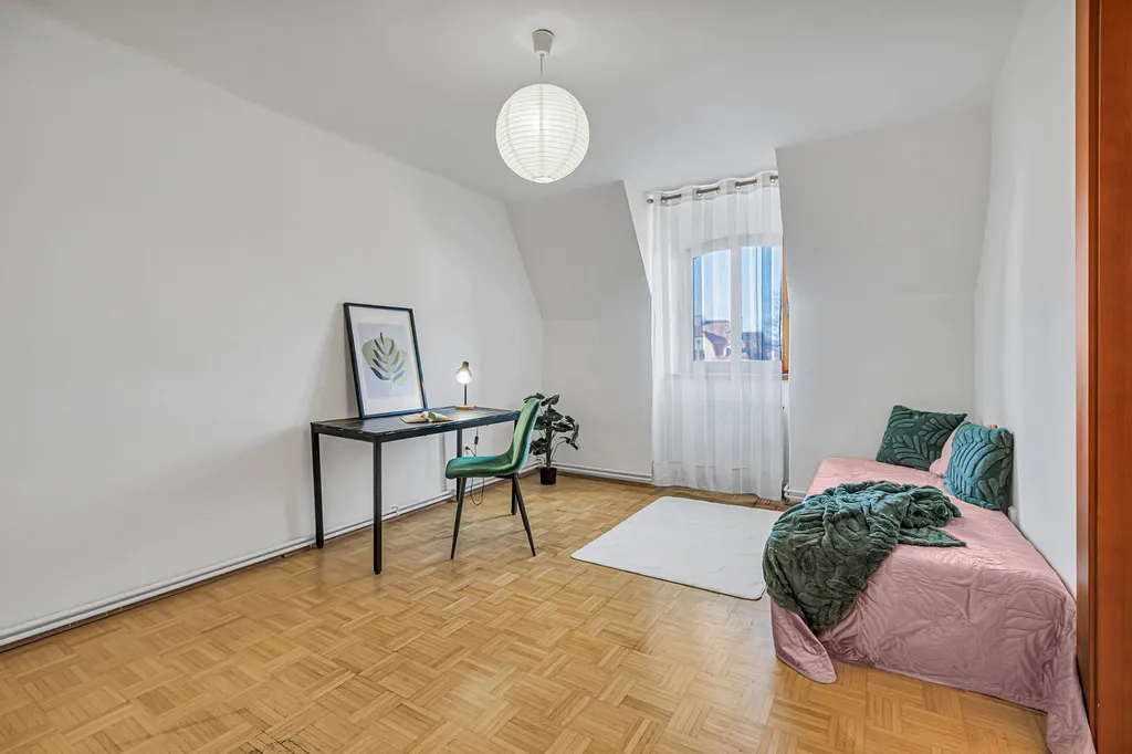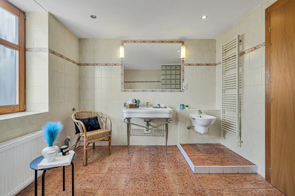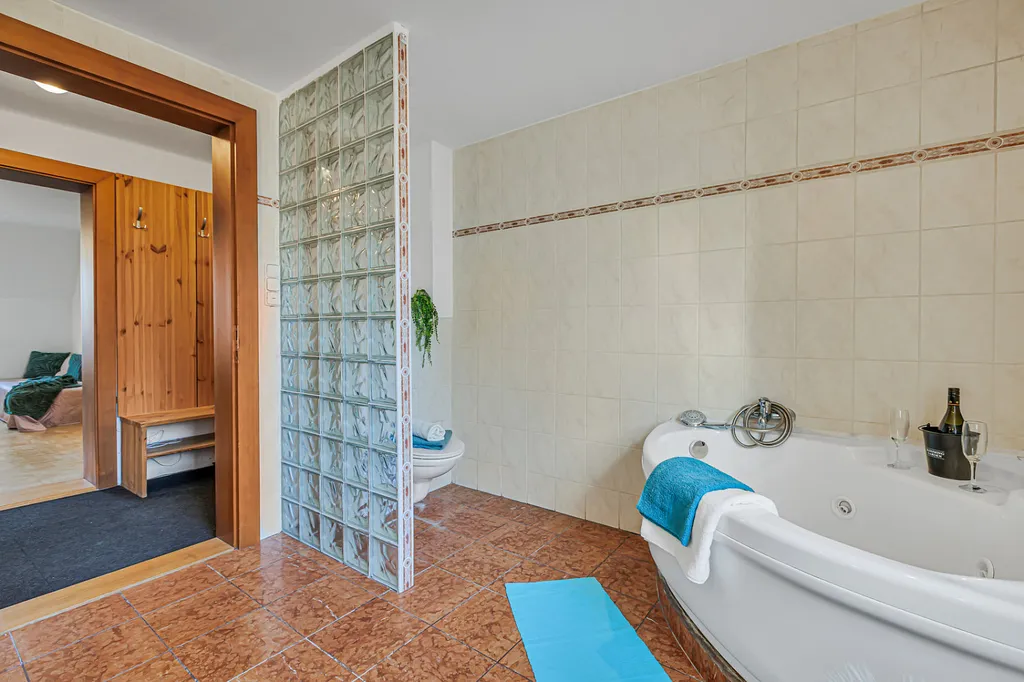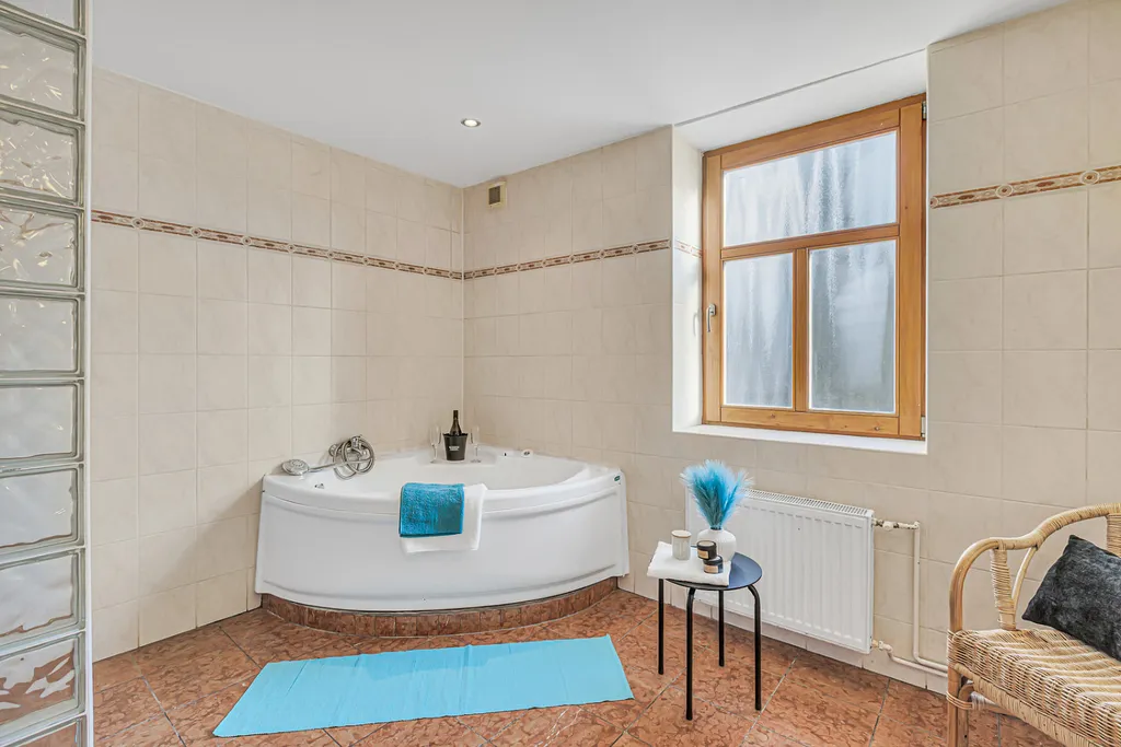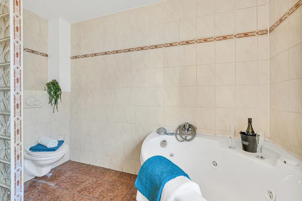 Velkým benefitem je nadstandardně prostorná koupelna s hydromasážní vanou a bidetem, která nabízí komfort, jaký dnes v bytech často nenajdete.