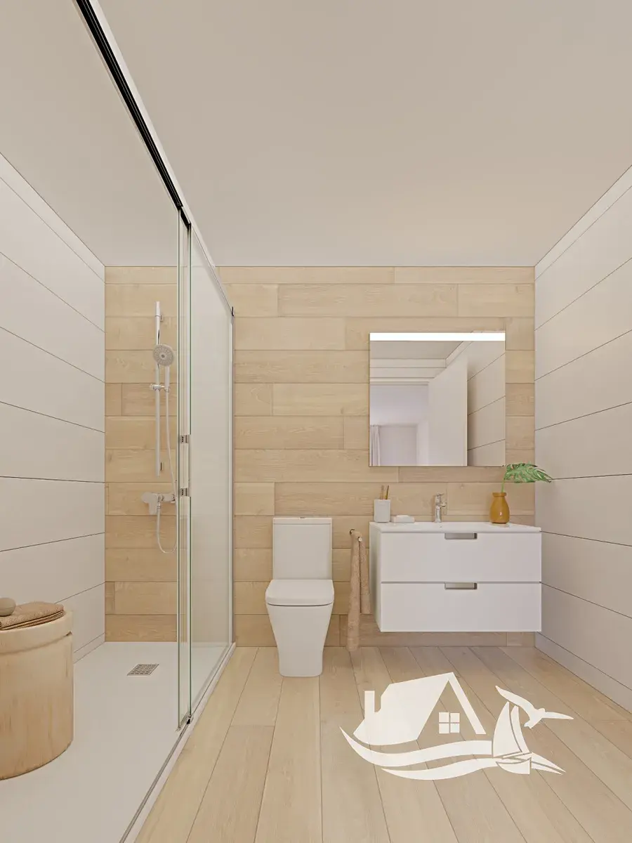 Interiér je navržen s důrazem na kvalitu a praktičnost. Podlahy z porcelánové kameniny dodávají prostoru elegantní a odolný charakter. Kuchyně je plně vybavená moderními spotřebiči a přirozeně propojená s obytnou částí. Vestavěné skříně zajišťují dostatek úložného prostoru a kvalitní hliníková okna přispívají k energetické efektivitě. O komfort během celého roku se stará aerotermální systém a tepelné čerpadlo. Samozřejmostí je také příprava pro nabíjení elektromobilu.