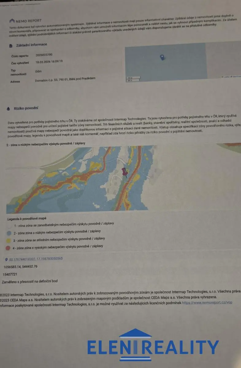Sháníte si domeček k trvalému bydlení nebo prostě jen rekreační chalupu, kde můžete s rodinou trávit čas nejen o víkendech, ve velmi atraktivní a vyhledávané lokalitě Domašov, Bělá pod Pradědem? Exkluzivně nabízíme k prodeji rodinný dům se zastřešenou terasou a rovinatou zahradou v obci Bělá pod Pradědem-Domašov , cca 3 km od známého Skiareálu Filipovice a 5 km od města Jeseník. K domu náleží pozemek akorát o celkové výměře 785 m2, z toho zastavěná plocha a nádvoří rodinného domu činí 311 m2. Na domě probíhala v uplynulých letech rekonstrukce, zahrnující nové rozvody topení, novou elektroinstalaci i vodoinstalaci, zastřešení terasy, snížení stropů sádrokartonovými podhledy atd. a nabízí možnost okamžitého užívání dispozice 4+1 (možnost rozšíření o půdní prostory). Budova je zděná cihly, tvárnice, má dvě nadzemní podlaží a je z části podsklepená. Ústřední vytápění zajištuje plynový kotel, umístěný v technické místnosti anebo lokálně krbová kamna , umístěná v obývacím pokoji (komín je vyvložkovaný). Ohřev vody elektrickým bojlerem, elektřina 230/400, voda i kanalizace obecní. Parkování na vlastním pozemku u domu pro 4 automobily. Dispozice: 1. NP: vstupní chodba, obývací pokoj s krbovými kamny, kuchyň se vstupem do zahrady, dva pokoje a prostorná koupelna s vanou a WC. Po dřevěném schodišti s podestou se dostanete do 2.NP, kde se nachází další pokoj ( využívaný zejména v letním období )a vstup na půdu. Součástí prodeje je dřevník a skleník, umístěný na zahradě. U vstupu do domu je velmi praktická zastřešená, terasa s venkovním posezením s možností grilování, technická místnost s WC ( zde je umístěn i elektr. bojler a plynový kotel) a dílna. Jednoznačnou výhodou je umístění v turisticky zajímavé a oblíbené lokalitě Jeseníků. K domu k dispozici pasport stavby a stavební dokumentace. Povodňová zóna 2 ( viz fotodokumentace). Průkaz energetické náročnosti budovy nebyl dodán, proto v souladu se zákonem uvádíme klasifikační třídu G. Pokud máte zájem o více informací a chcete nemovitost shlédnout osobně, domluvte si termín prohlídky s makléřkou Eleni ( volat po 13 hod.)