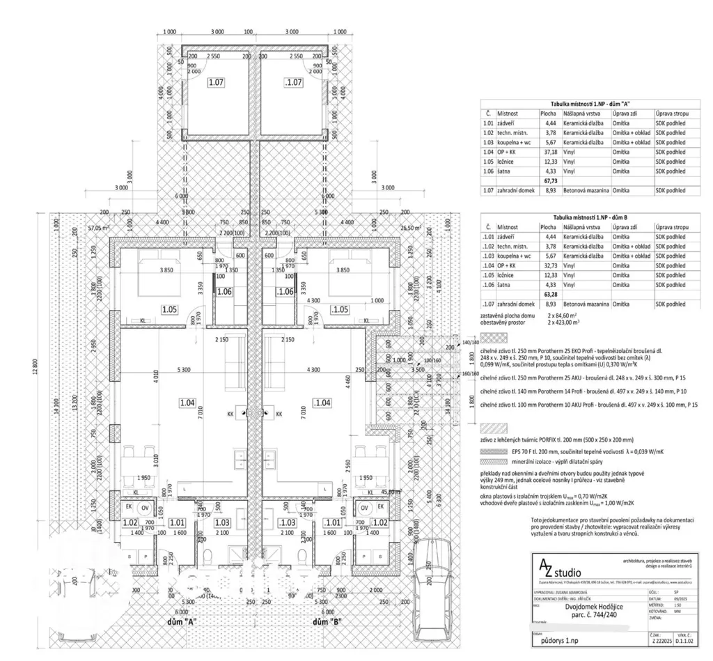 Nabízený dům - bytová jednotka A je přízemní o dispozici 2+kk s celkovou užitnou plochou 67,27 m². V průběhu výstavby je možné dispozici upravit na 3+kk. Budoucí majitel si tak může přizpůsobit bydlení podle svých potřeb.