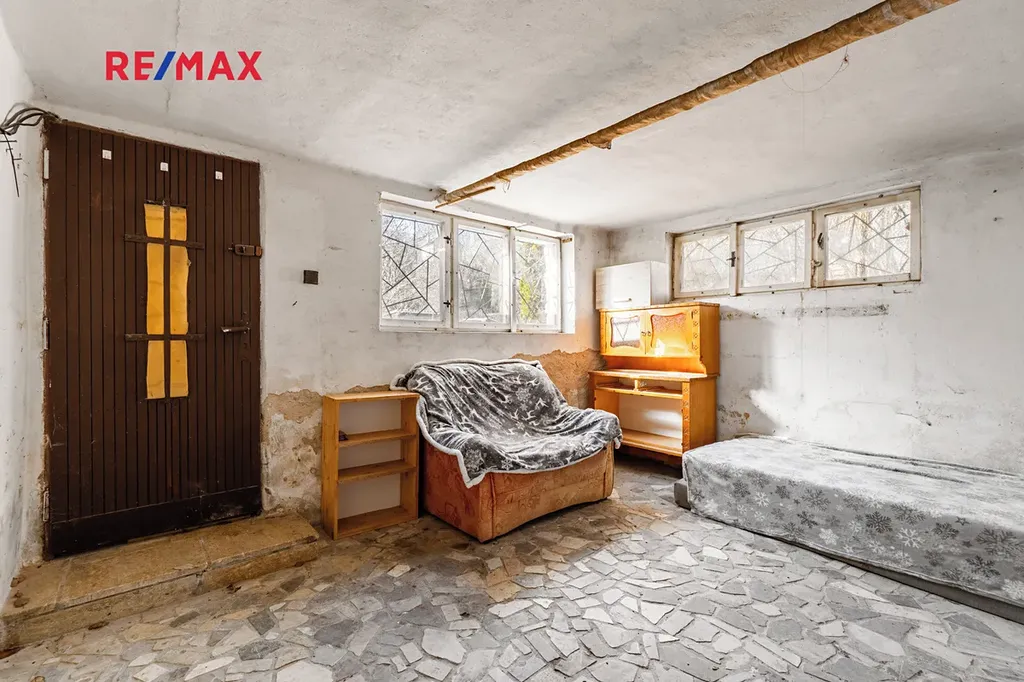 Pod terasou je k dispozici garáž a další místnost se samostatným vstupem (14 m²), původně kotelna, kterou lze snadno upravit na obytný prostor.