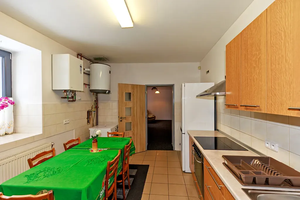 Objekt se prodává včetně většiny vybavení nábytkem a spotřebiči. Parkovací plocha je v pronájmu a je majetkem Města. Zavedena je WiFi, pevný O2 internet a optický kabel se bude letošní rok 2026 realizovat. Každý byt má svůj setobox. Každá bytová jednotka je opatřena vlastním kotlem pro vytápění, napojený na elektřinu a teplo je rozvedeno do radiátorů. Dále každá bytová jednotka má zajištěný vlastní bojler pro ohřev vody. Bojlery jsou vyměněny za nové postupně v průběhu posledních 5 letech. Dům je vytápěn navíc krbem, který lze vidět na fotografiích. Tento krb navíc vytápí i komerční prostor (č. 8) Zabudované jsou odpočtové hodiny (elektroměry) a to celkem na 7 bytů. Samostatný elektroměr je pro nebytový prostor č.8 Náklady za energie na bytovou jednotku jsou nastaveny ve výši 2000 Kč (tato položka účtuje topení, elektřinu, ohřev vody) a další poplatky.
