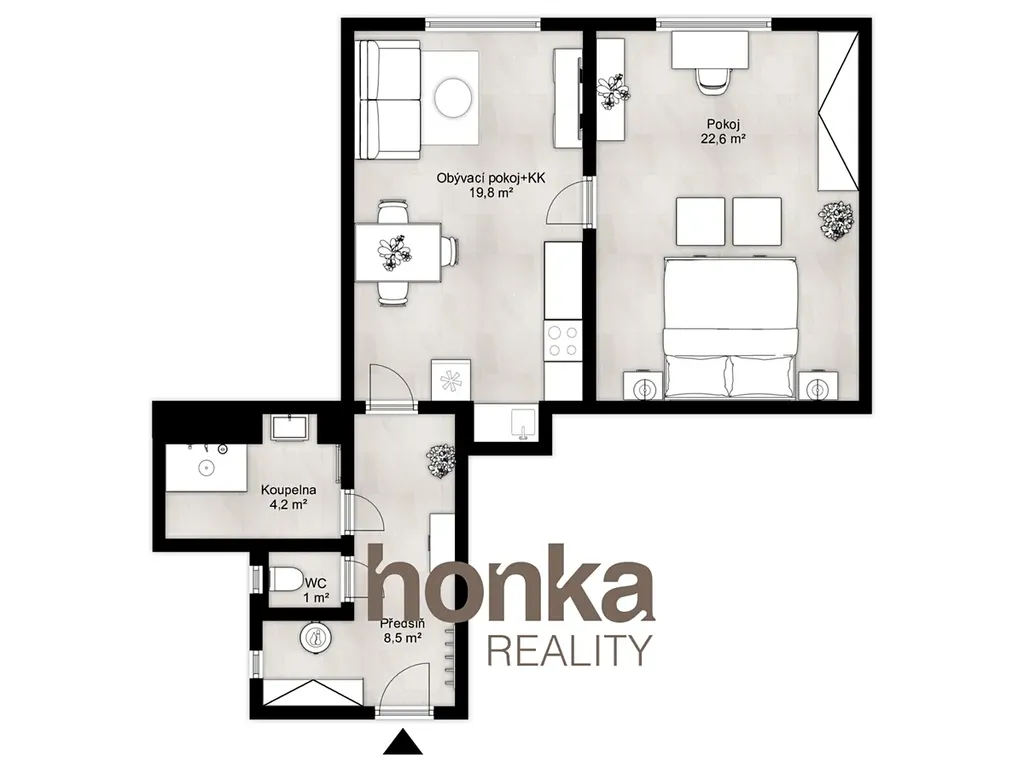 Dispozice: Obývací pokoj s kuchyňským koutem, samostatná ložnice, koupelna se sprchovým koutem a samostatné WC. Kuchyň je vybavena moderními spotřebiči včetně lednice.
