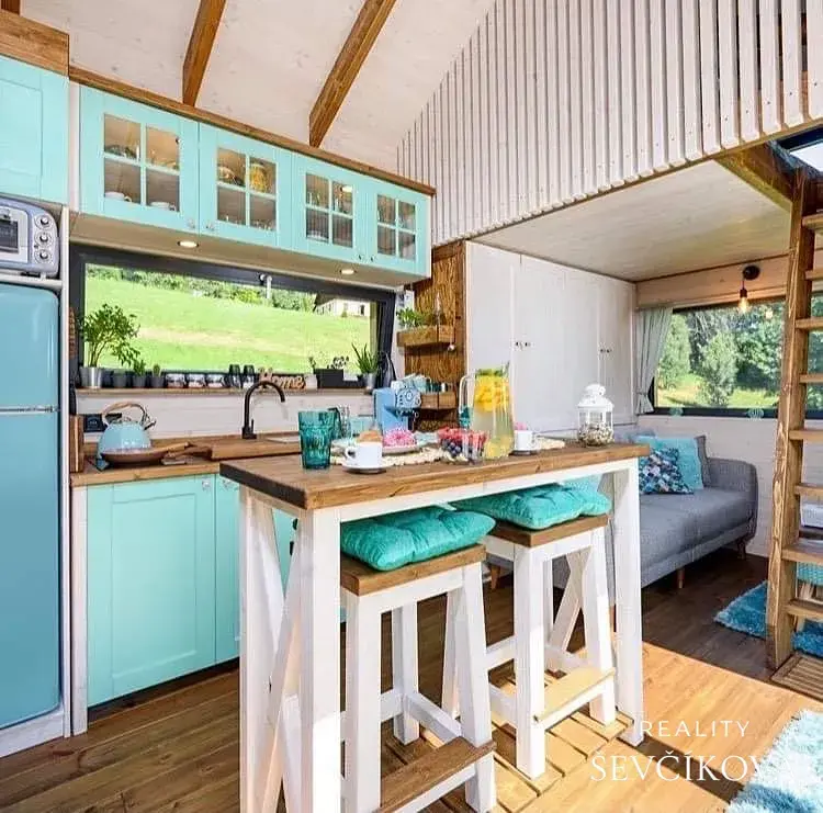 Nabízíme prodej kompletně zařízeného mobilního domu o obytné ploše 22m2 + 19 m2 terasa a je připraven k okamžitému užívání bez dalších investic.