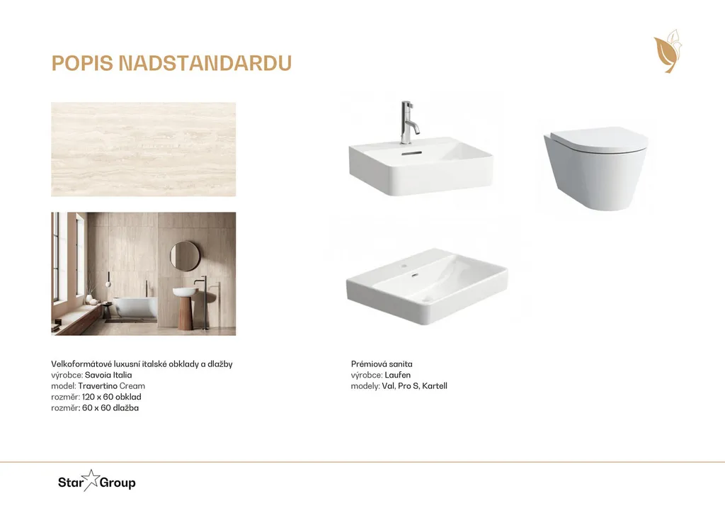 - prémiový standard provedení: velkoformátové obklady a dlažba Savoia Italia, designová sanita Laufen (již v ceně bytu)