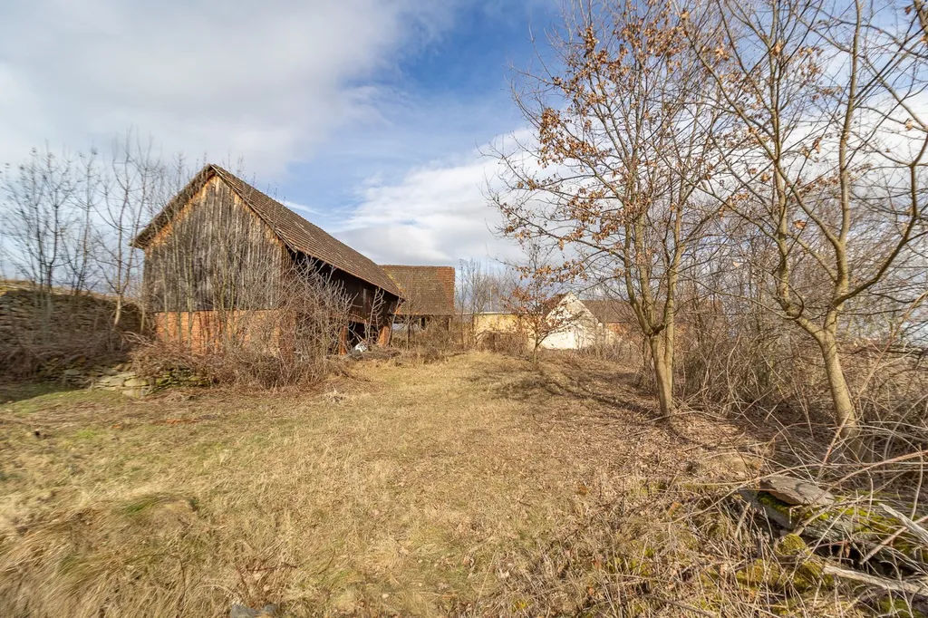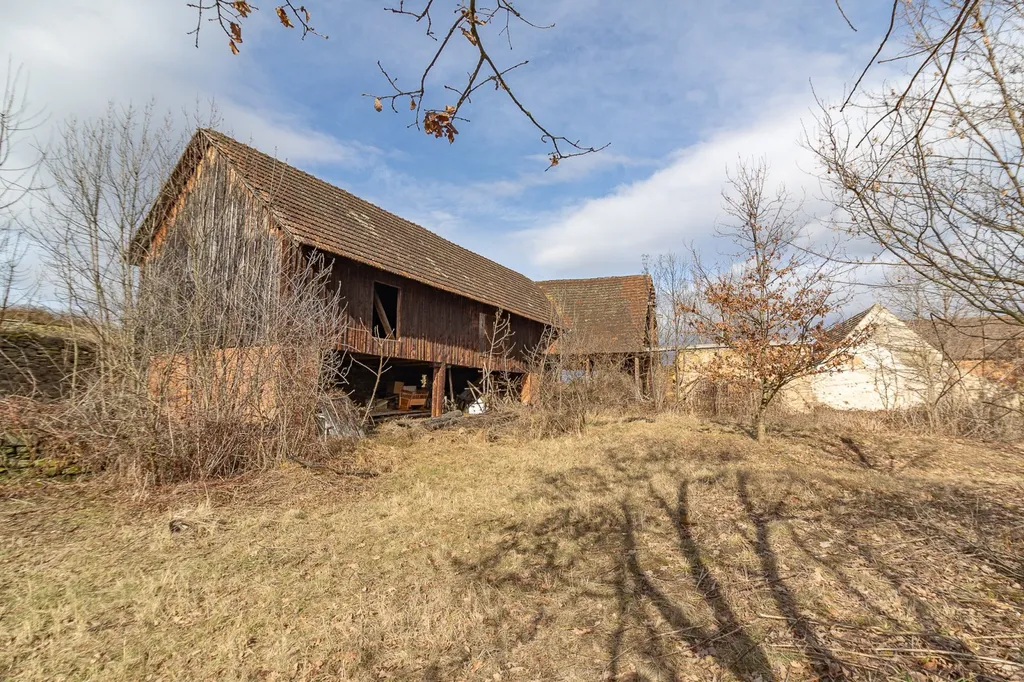 Dominantou uzavřeného dvora, který poskytuje naprosté soukromí, je velká, částečně otevřená stodola o zastavěné ploše 158 m². Tato unikátní stavba stojí na masivních zděných cihlových sloupech, které jí dodávají netradiční vzhled. Její horní dřevěná část historicky sloužila jako sklad sena a dnes nabízí obrovský prostor pro kreativní využití, od zahradního ateliéru až po velkorysé společenské zázemí. Obrovskou výhodou je přítomnost kvalitního stavebního materiálu přímo na pozemku – původní kámen a dřevěné trámy jsou připraveny k dalšímu využití, což stavbě dodá autenticitu a novému majiteli ušetří náklady.