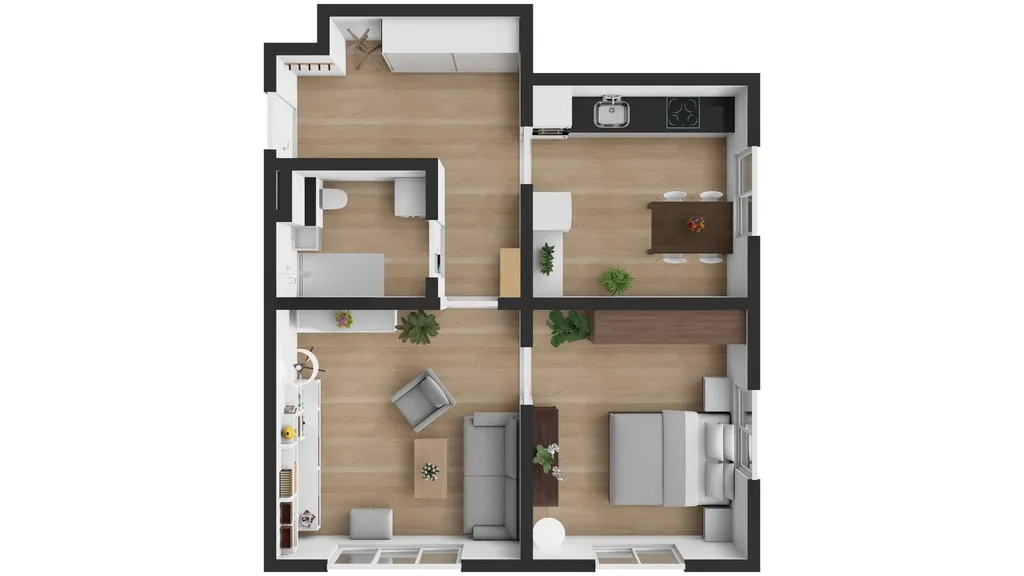 Koupelna disponuje sprchovým koutem se závěsným WC a je zde také prostor pro pračku se sušičkou. Na podlaze je položen vinyl, který dodává bytu moderní vzhled.