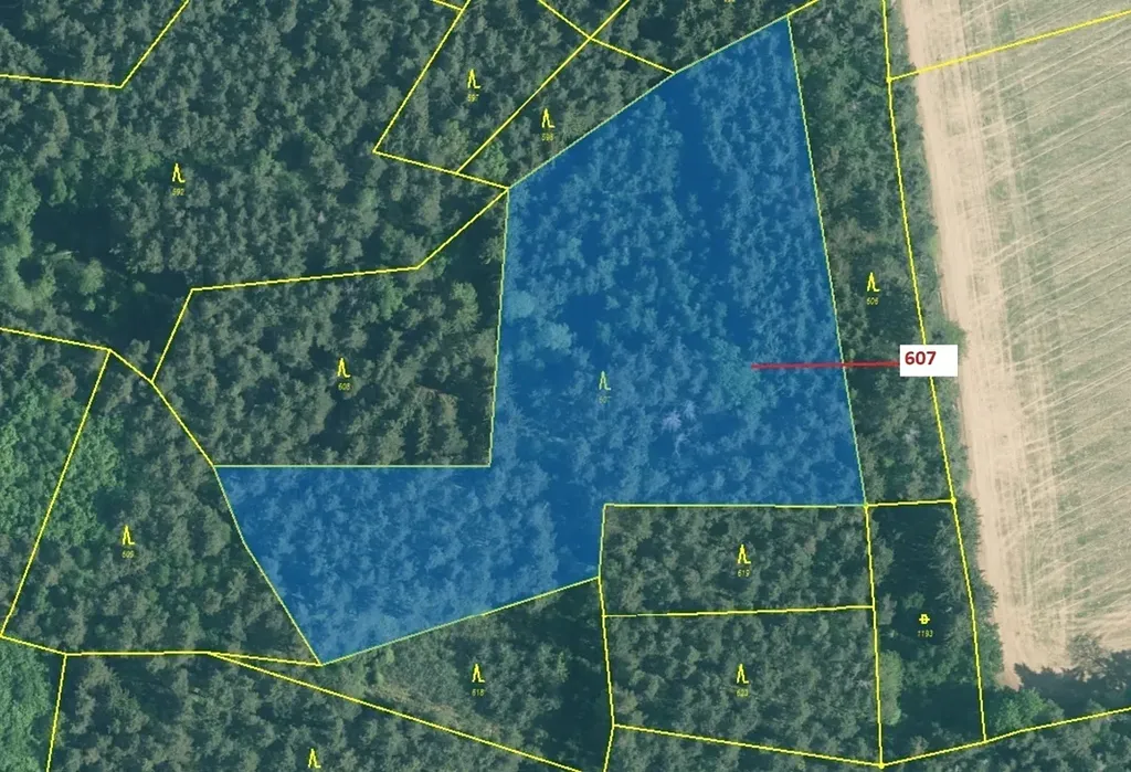 Lesní pozemek o výměře 10 437 m2, parcelní číslo 607, podíl 1/1, katastrální území Kuřimany, obec Kuřimany, obec s rozšířenou působností Strakonice, okres Strakonice, Jihočeský kraj. Částečně po těžbě.