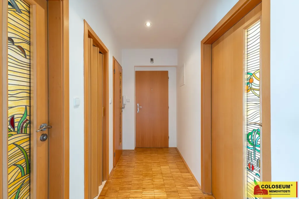 Byt dále nabízí samostatnou ložnici (12,3 m²), prostornou koupelnu s vanou (6,6 m²), oddělené WC (1,1 m²) a praktickou šatnu (1,3 m²). Celková podlahová plocha bytu činí 61 m² (balkon není započítán do této výměry).