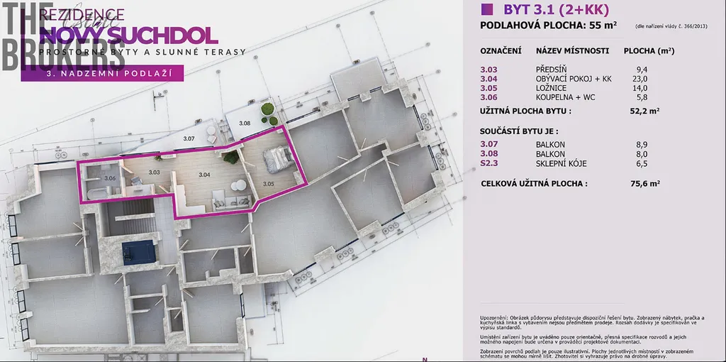 Celková plocha bytu je 75,6 m² a skládá se z bytové jednotky o dispozici 2+kk ( 52,2 m²) a dvou balkonů ( 8,9 m² a 8 m²). Jeden navazuje na obytnou místnost a druhý je součástí ložnice. Jednotka je umístěna ve 2. patře. Součástí bytu je sklepní kóje ( 6,5 m²) a lze dokoupit garážové stání v podzemní garáži domu.