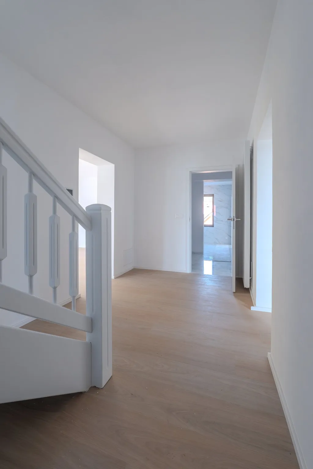 Horní patro nabízí velké zázemí pro pracovnu nebo další dětský pokoj, samostatné WC a velkorysou terasu s přípravou na vířivku a fotovoltaiku. Ve spojení s tepelným čerpadlem tak byt nabízí komfort moderního bydlení s minimálními provozními náklady.