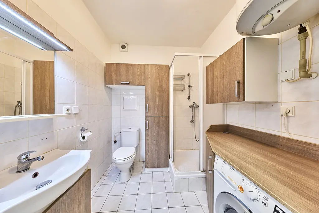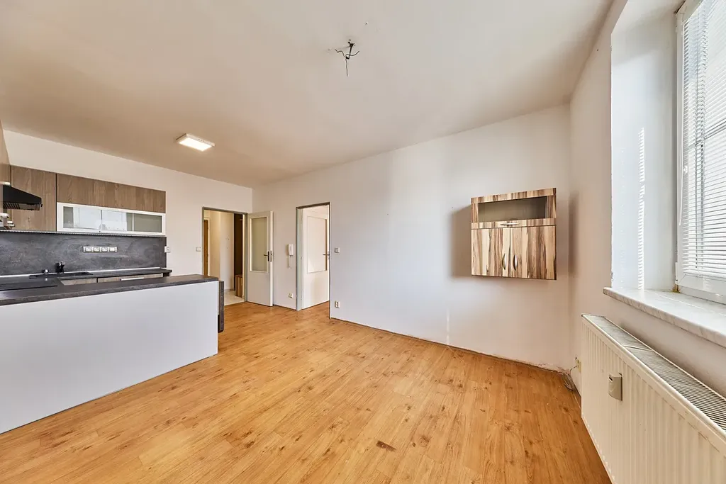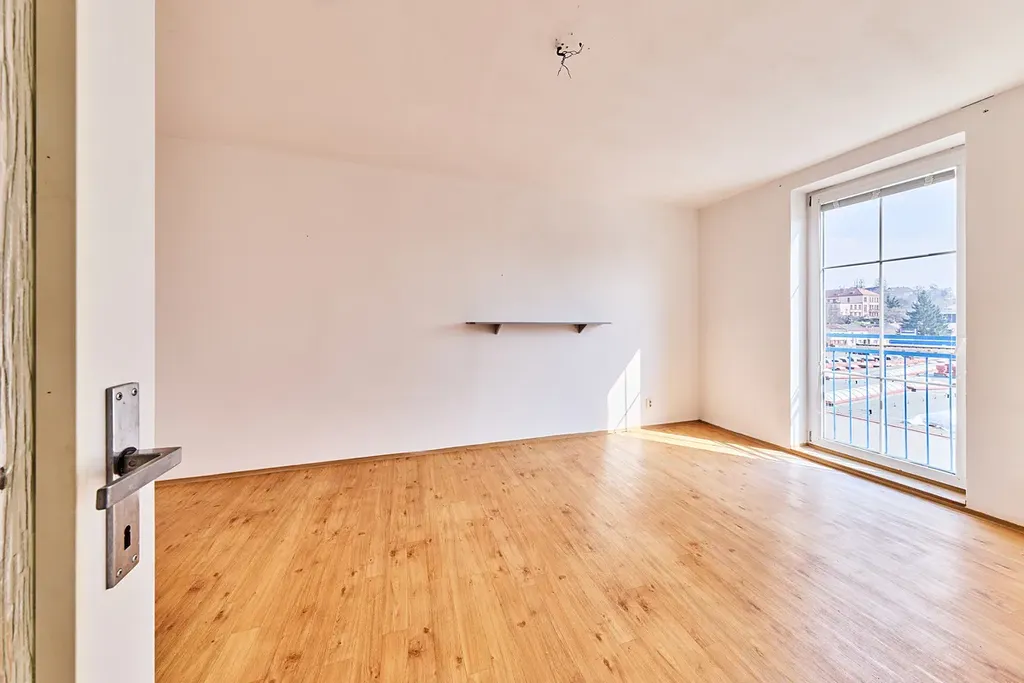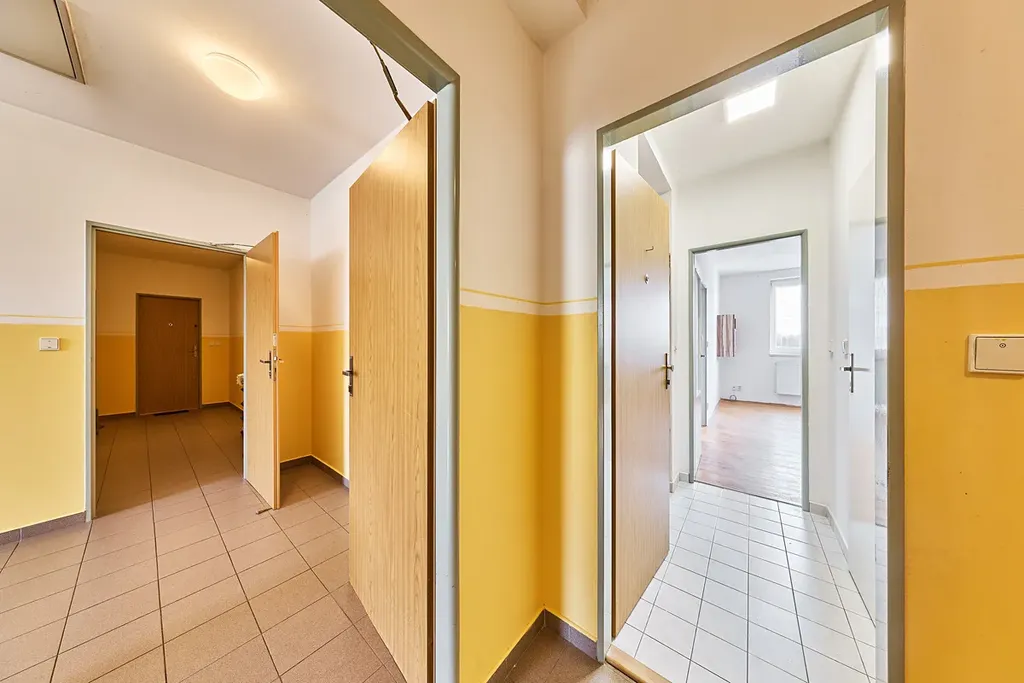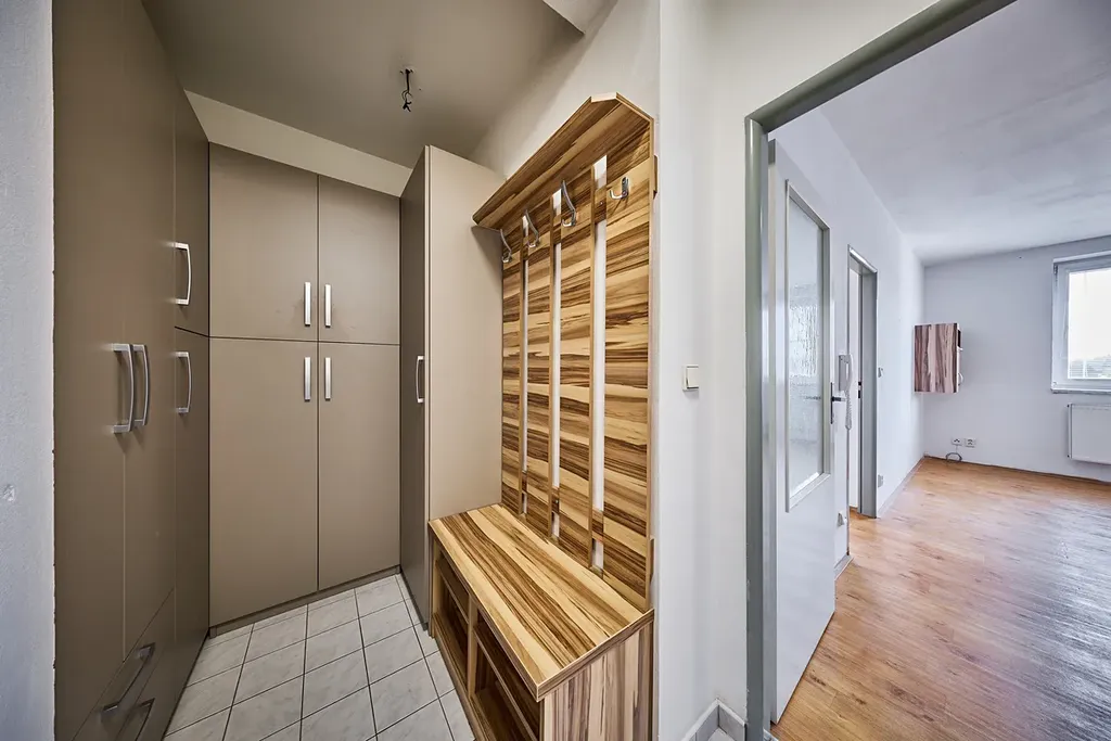 Dispozice: Vstupní předsíň (4,3 m2) s praktickými vestavěnými skříněmi, po pravé straně jsou dveře do koupelny (3,9 m2). Rovně je obývací pokoj s kuchyňským koutem (17,4 m2), ze kterého je vstup do ložnice (18,1 m2). V ložnici je francouzské okno se zábradlím.