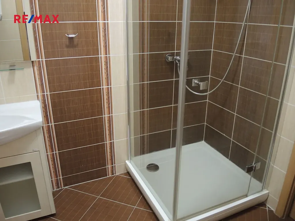 Koupelna je se sprchovým koutem, umývadlem, přípojkou na pračku, toaleta oddělena.