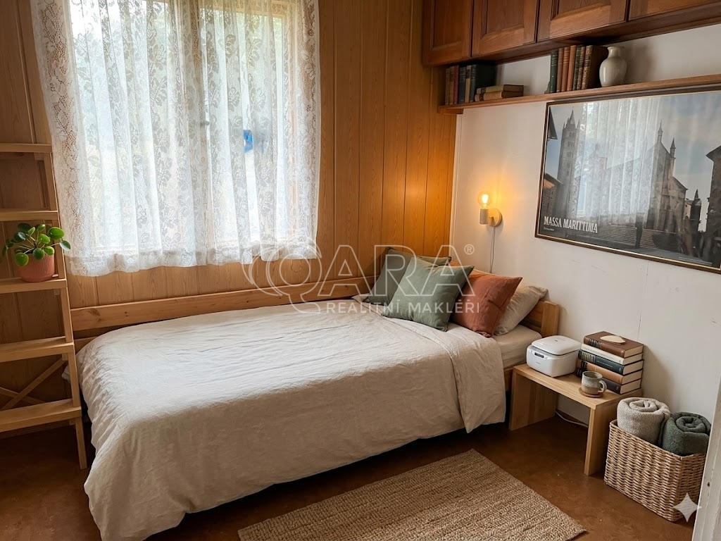 Horní patro: Slunný obývací pokoj, plně vybavená kuchyně s jídelním koutem, špajz, menší ložnice, samostatné WC a prostorná zasklená veranda (zádveří), která slouží jako příjemný filtr mezi exteriérem a interiérem.