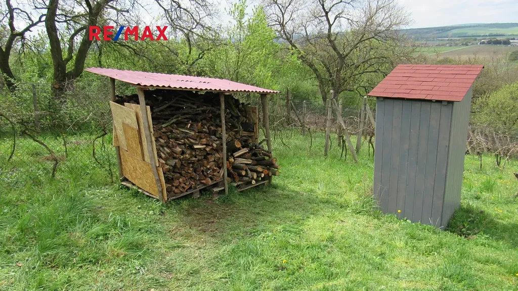 V horní části pozemku s krásným výhledem na Kyjov a okolí je postavena zděná chatka (6 m x 4 m).