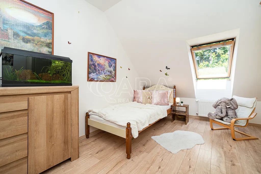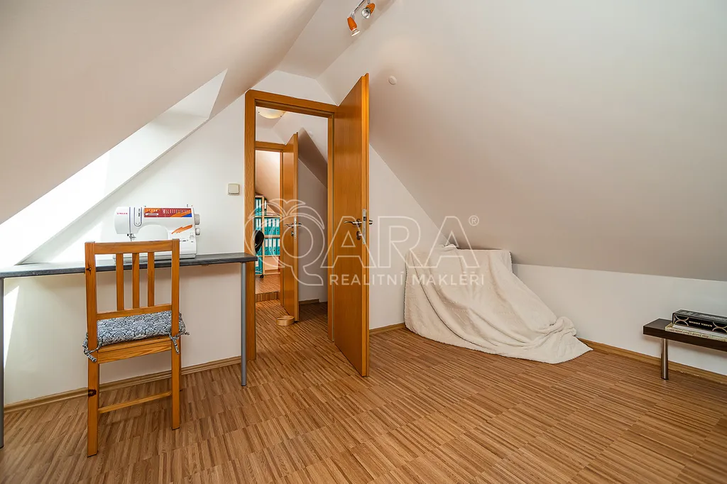 V podkroví se nacházejí dvě menší místnosti se zkoseným stropem, které skvěle poslouží jako tiché pracovny, ateliéry, dětské herny nebo další ložnice.