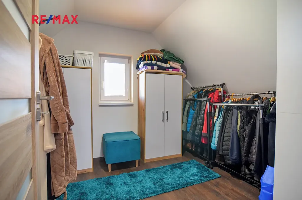 po dřevěných schodech vyjdeme do obytného podkroví, kde je velký pokoj, pracovna, šatna.