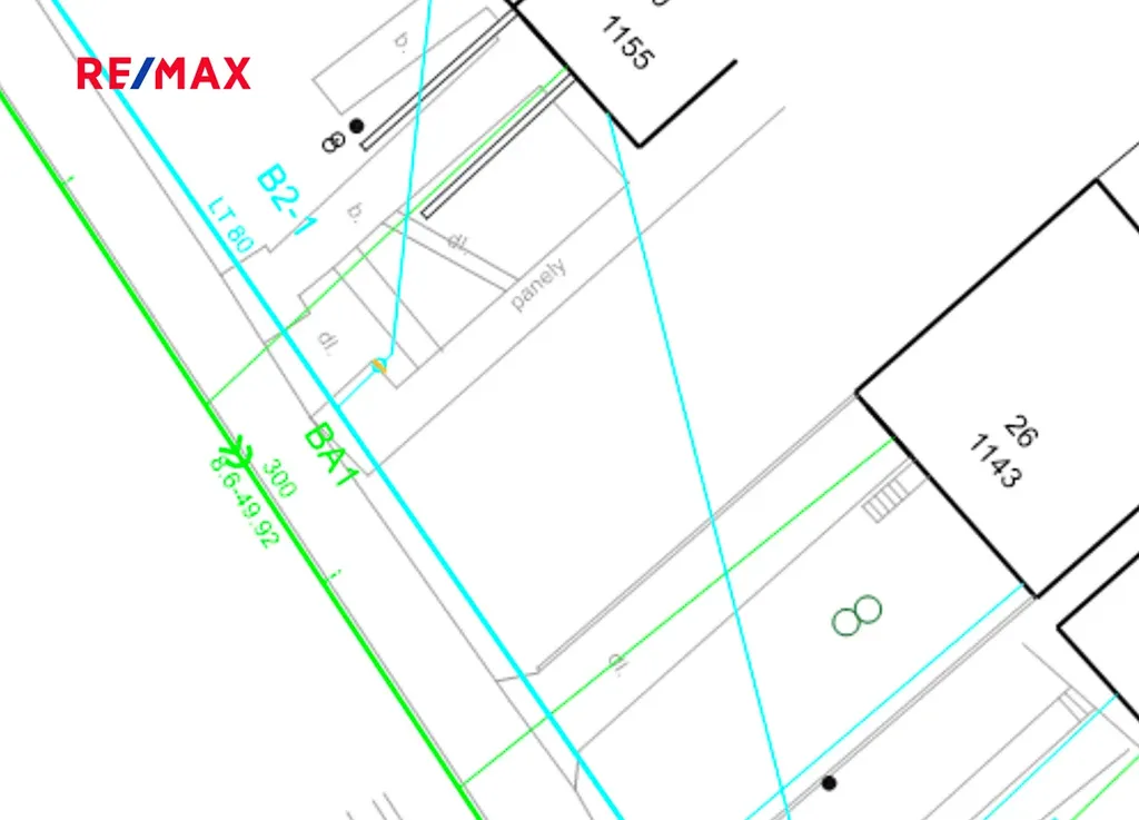 Inženýrské sítě: na pozemku nejsou přípojky, ale pozemkem vede vodovodní řád (na obrázku modře) a v ulici je i kanalizace (na obrázku zeleně).