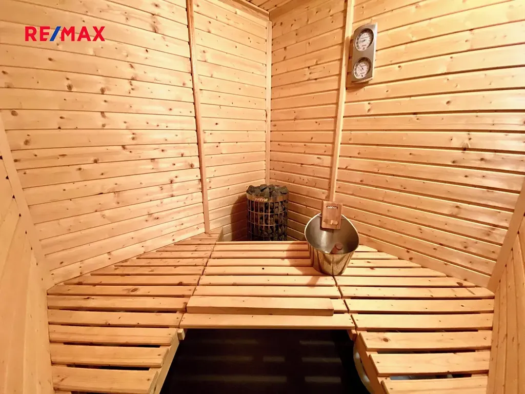 V přízemí domu je byt 1+kk, tj. pokoj (15 m2) s kuchyňským koutem s vestavěnou lednicí, koupelna se sprchovým koutem a toaletou. V přízemí je také sklad, kotelna a vstup do patrového bytu 4+kk, se saunou, krbem a sklepem. Kuchyňská linka bytu 4+kk obsahuje lednici s mrazákem, mikrovlnnou troubu, myčku, digestoř. V koupelně je vana, sprchový kout, velká sauna s odpočinkovým posezením, pračka, sušička a vstup do sklepa. V patře domu se nachází obývací pokoj s krbem, rekuperační jednotka, ložnice, dětský pokoj, menší toaleta, klimatizace. Nemovitost je pronajímána s veškerým vybavením a spotřebiči. Nemá žádnou zahradu ani dvorek. Před domem je vydlážděno 1 vlastní parkovací stání.