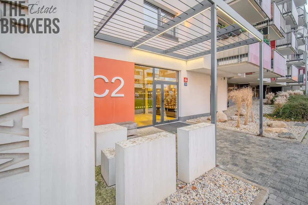 Byt je situován ve 3. nadzemním podlaží sedmipatrového cihlového domu postaveného v roce 2018. Jedná se o novostavbu, byt je ve velmi dobrém stavu a v osobním vlastnictví. Součástí nabídky je garážové stání, v domě je k dispozici také výtah. Budova je vybavena moderním zabezpečením v podobě dveří na čip a kamerového systému, což zajišťuje vyšší úroveň bezpečí.